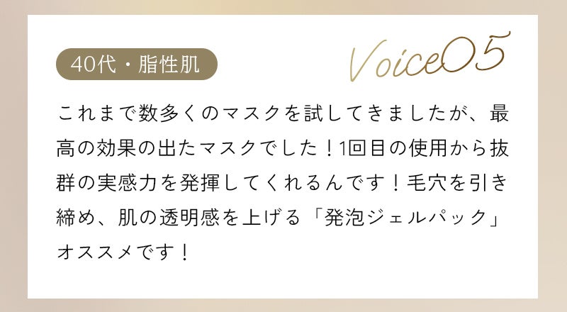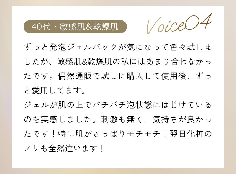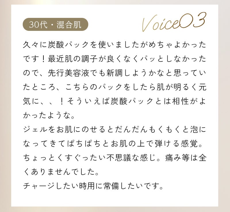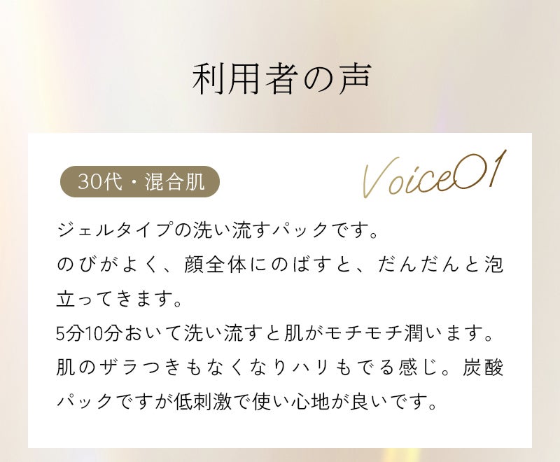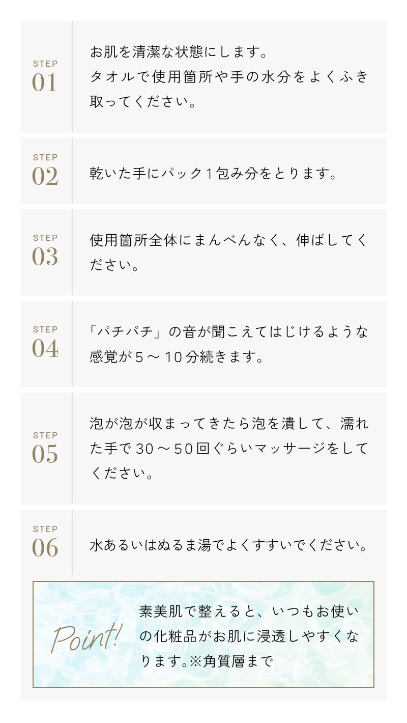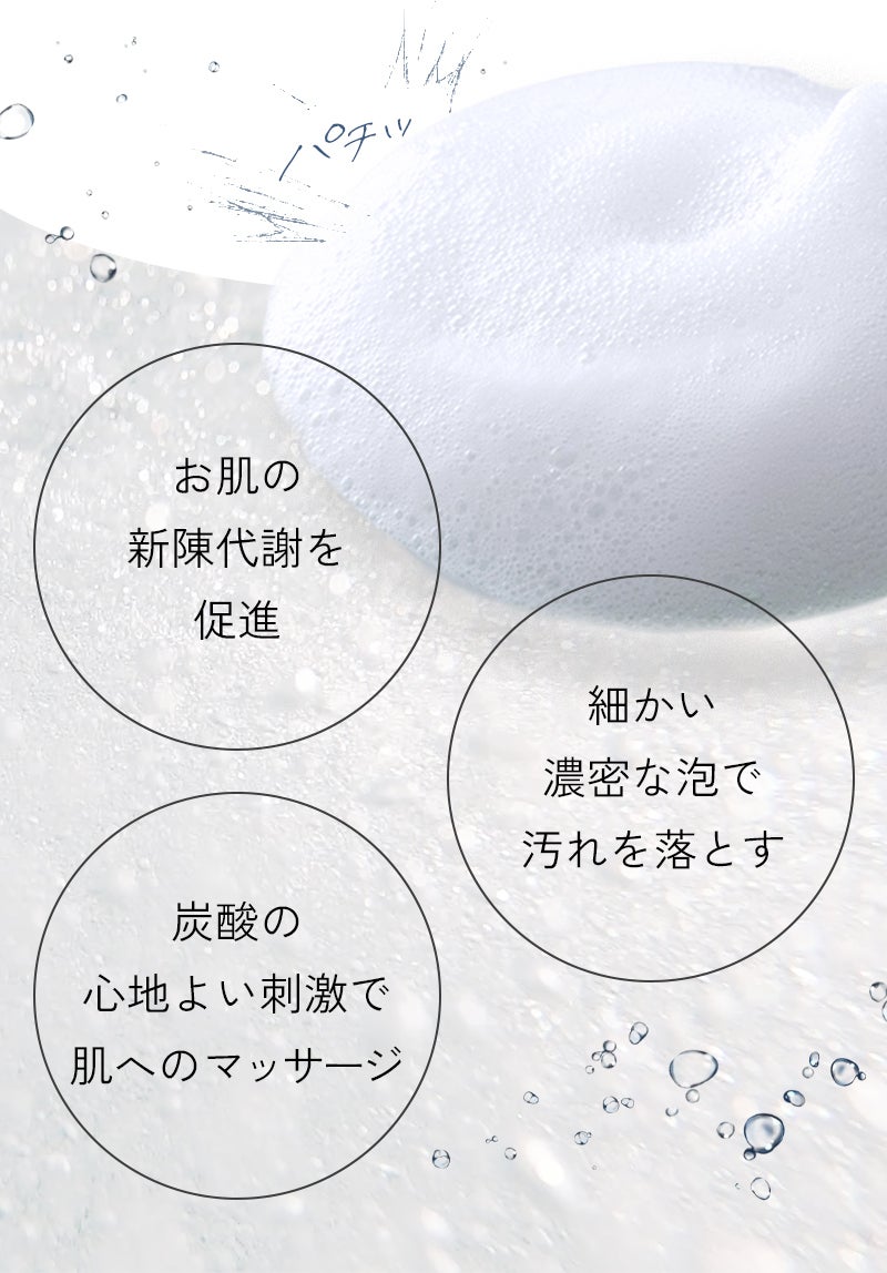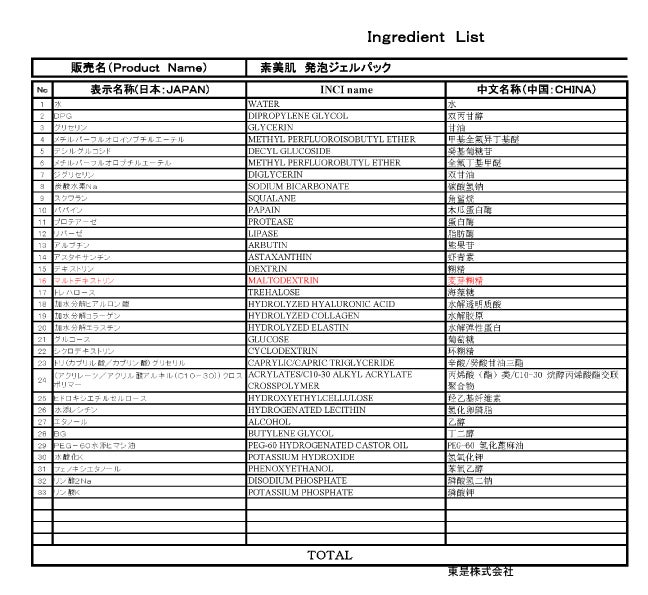 水、DPG、グリセリン、メチルパーフルオロイソブチルエーテル、デシルグルコシド、メチルパーフルオロブチルエーテル、ジグリセリン、炭酸水素Na、スクワラン、パパイン、プロテアーゼ、リパーゼ、アルブチン、アスタキサンチン、デキストリン、マルトデキストリン、トレハロース、加水分解ヒアルロン酸、加水分解コラーゲン、加水分解エラスチン、グルコース、シクロデキストリン、トリ(カプリル酸/カプリン酸)グリセリル、(アクリレーツ/アクリル酸アルキル(C10-30))クロスポリマー、ヒドロキシエチルセルロース、水添レシチン、エタノール、BG、PEG-60水添ヒマシ油、水酸化K、フェノキシエタノール、リン酸2Na、リン酸K