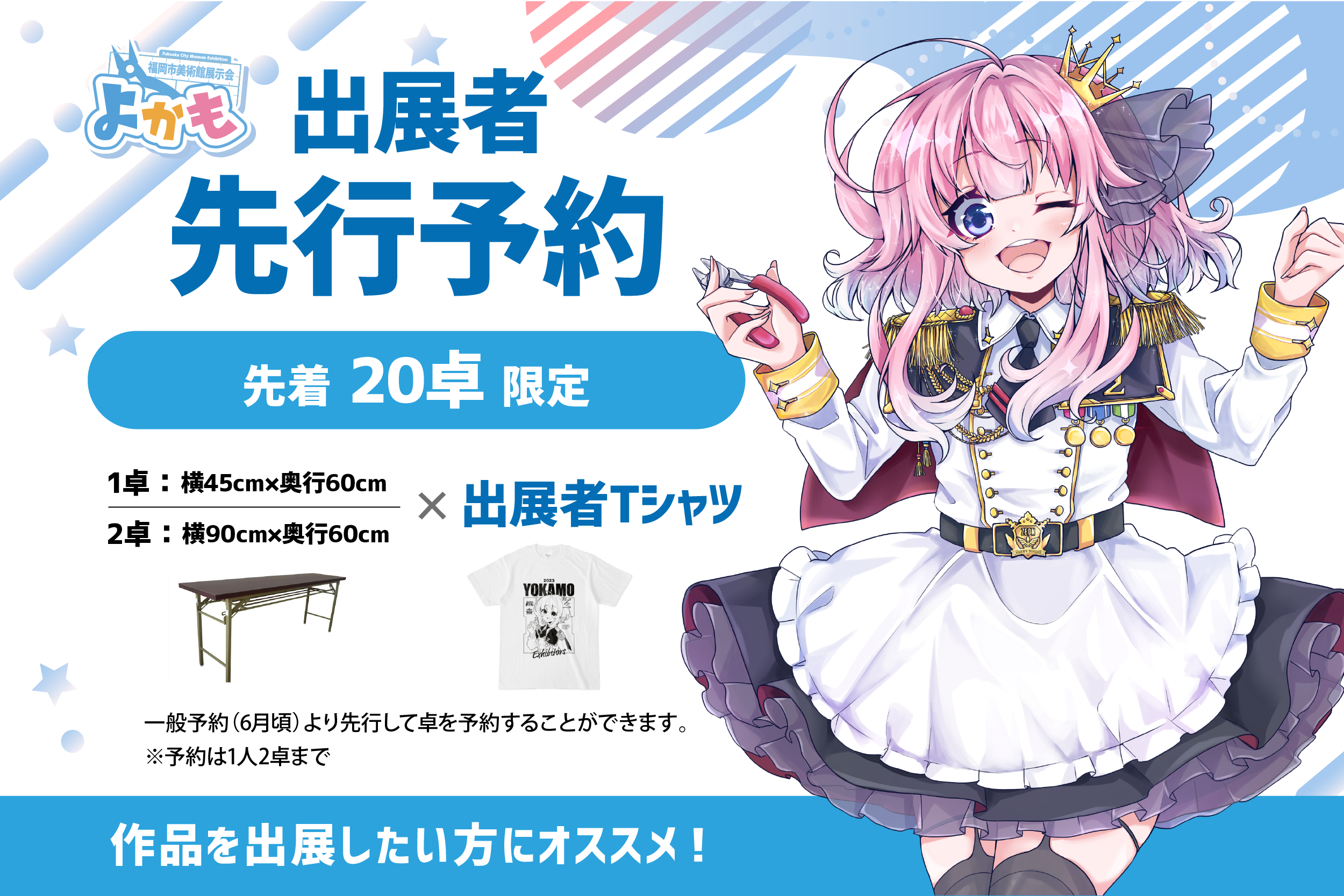 一般予約(6月頃)よりも先行して卓の予約ができるのと、出展者専用のTシャツが付いてくる!