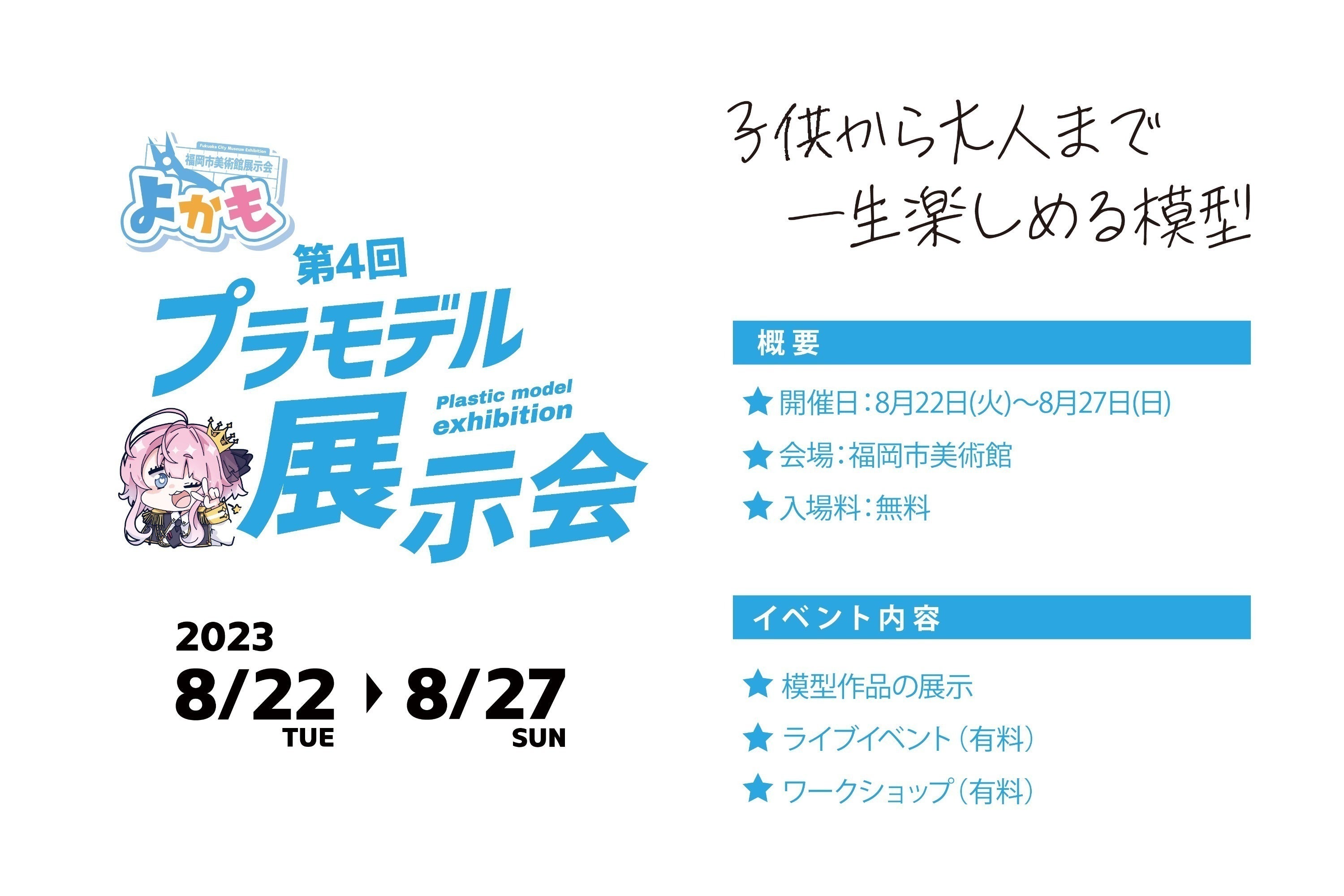 また、プラモデルで有名なアニメの主題歌を担当したアーティストたちをお迎えした『LIVE』や、子供たちと一緒に作る『ワークショップ』など、模型好きが楽しめるイベントも同時開催を考えております。