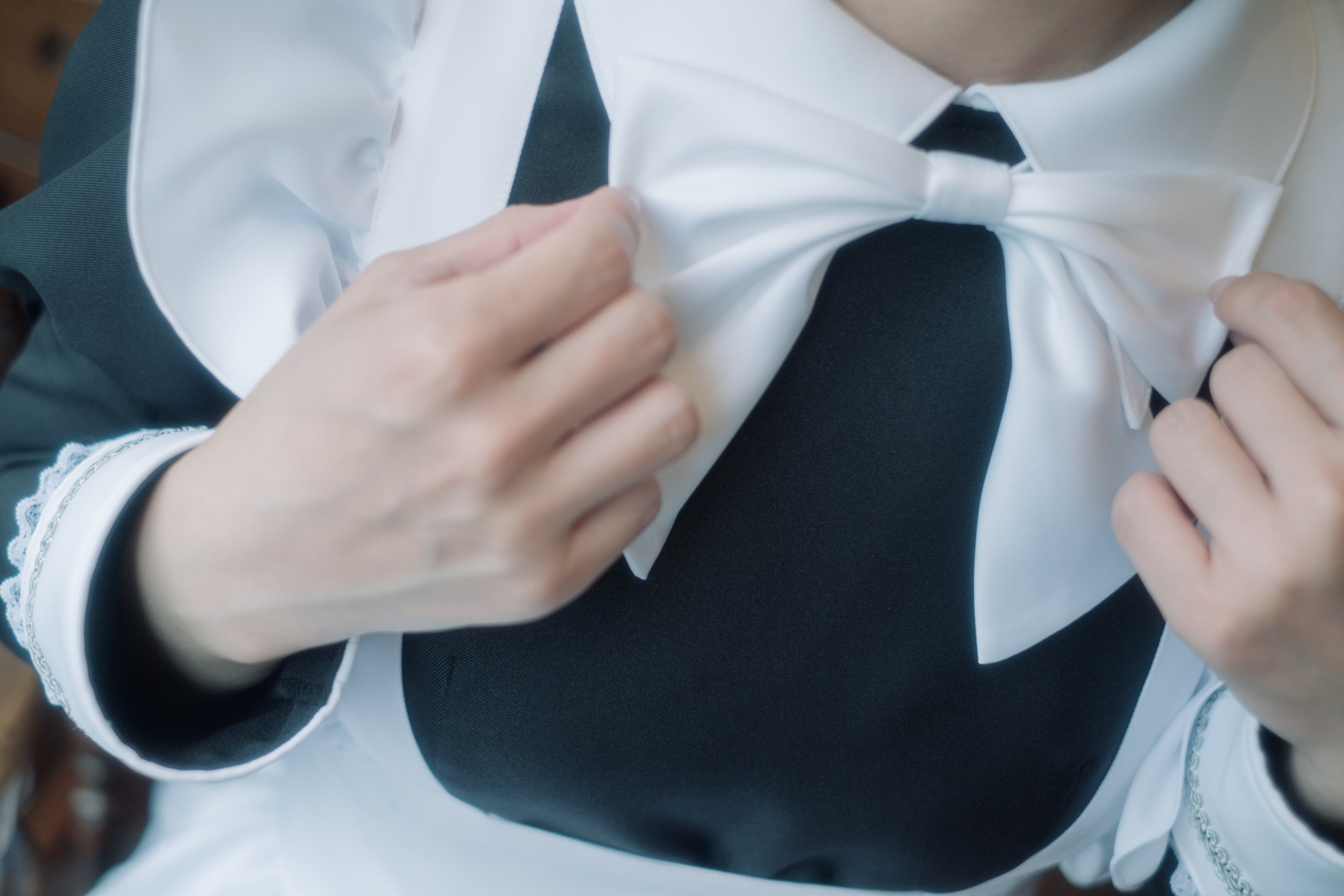 フリルのサイズ感やシルエットを始めとしたデザイン性と、働いてきた中で制服として求める機能性を大事に、シンプルかつ美しく見える形を。装飾は最小限に留めています。胸元のスカーフは店長・副店長のみが着用。通常はリボンとなります。
