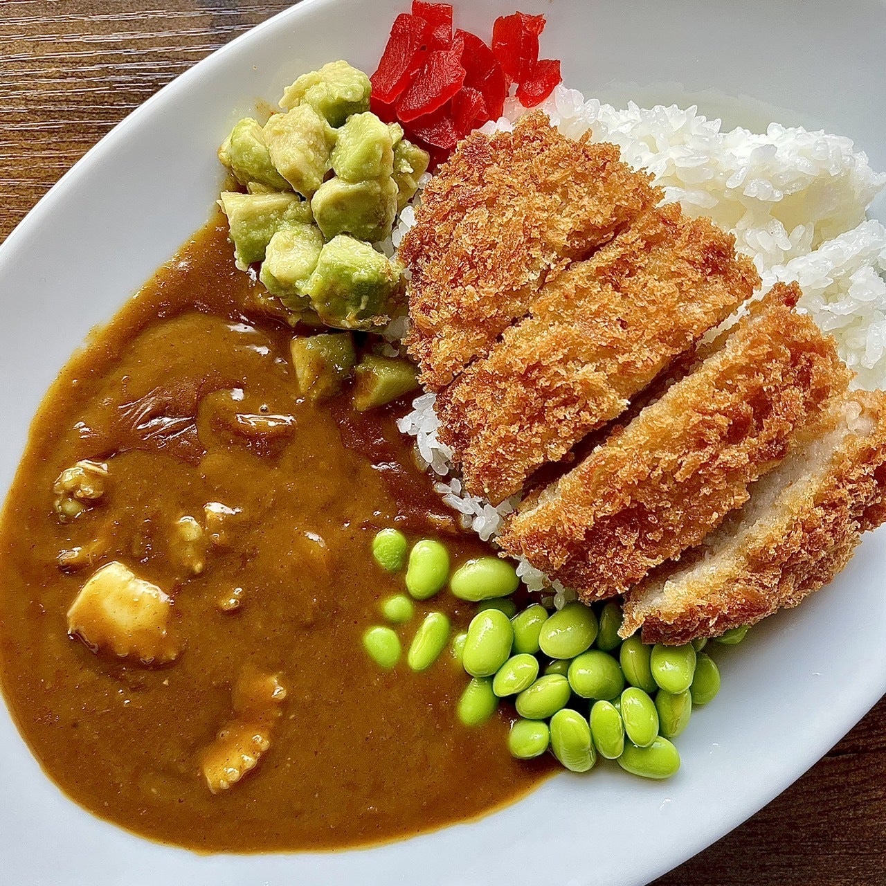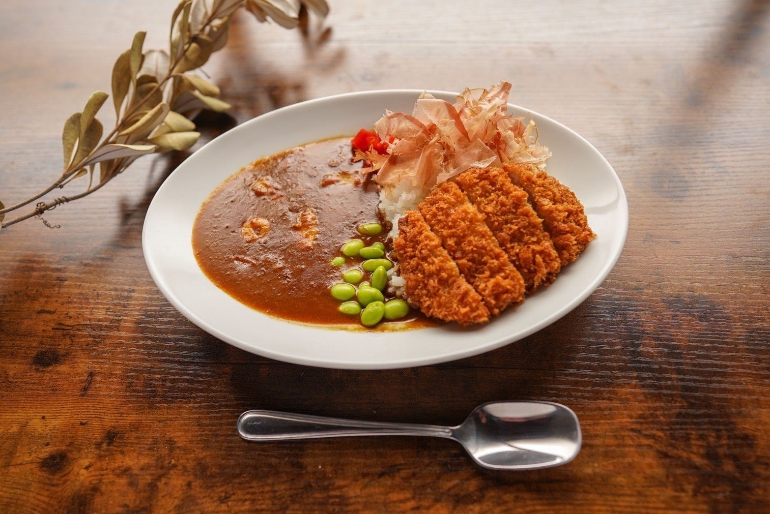 【お出汁×カレーライス】カレーはカツに合わせて設計してあり、花かつおのトッピングが絶妙です!ポリポリの枝豆は食感のアクセントに。