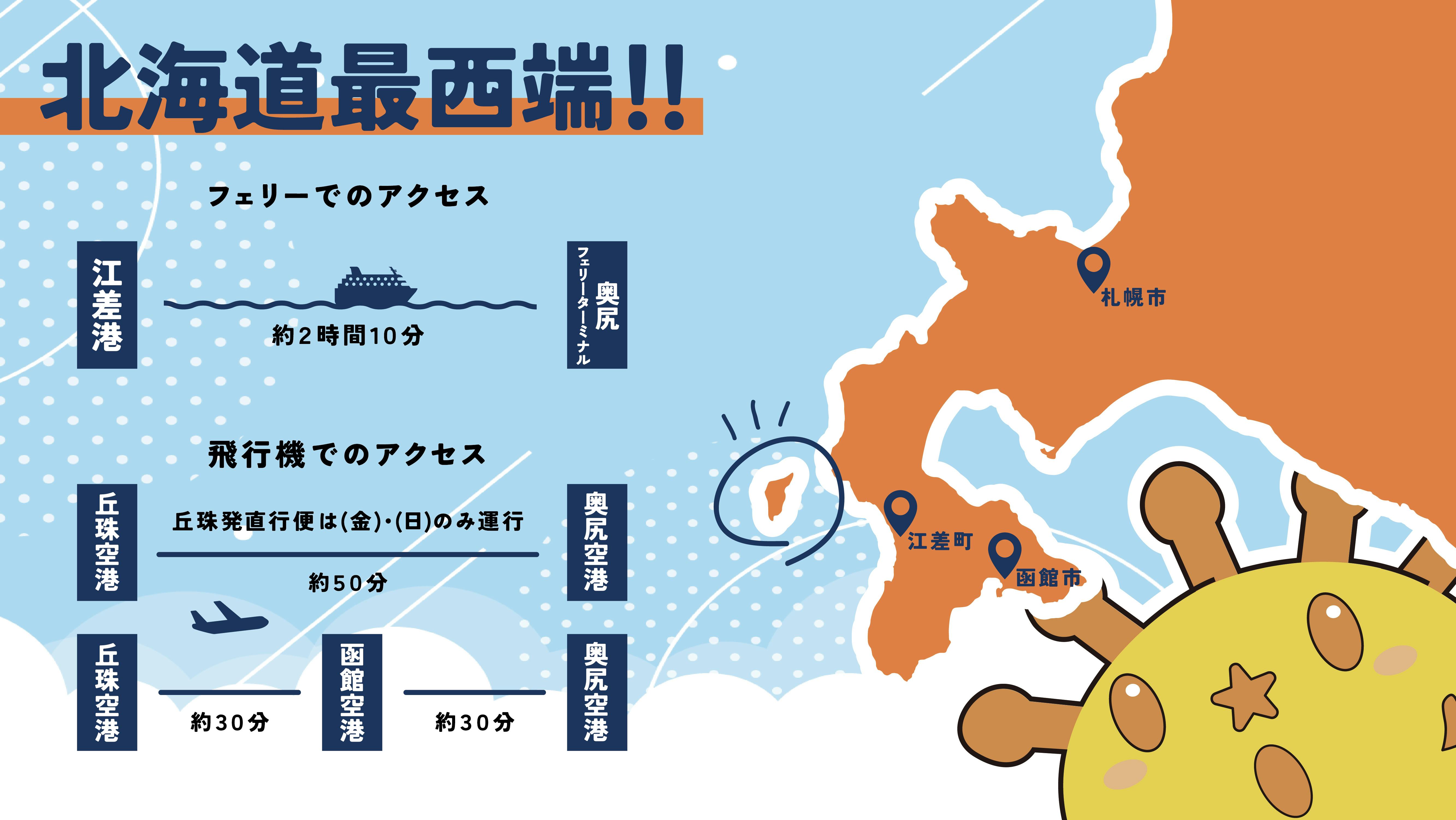 奥尻島は北海道の最西端に位置し、日本海に浮かぶ離島です。アクセスは江差町からフェリーで約2時間、函館空港から飛行機で約30分!島の周囲は実に84kmにも及び、複雑な海岸線は海の幸の宝庫となっています。