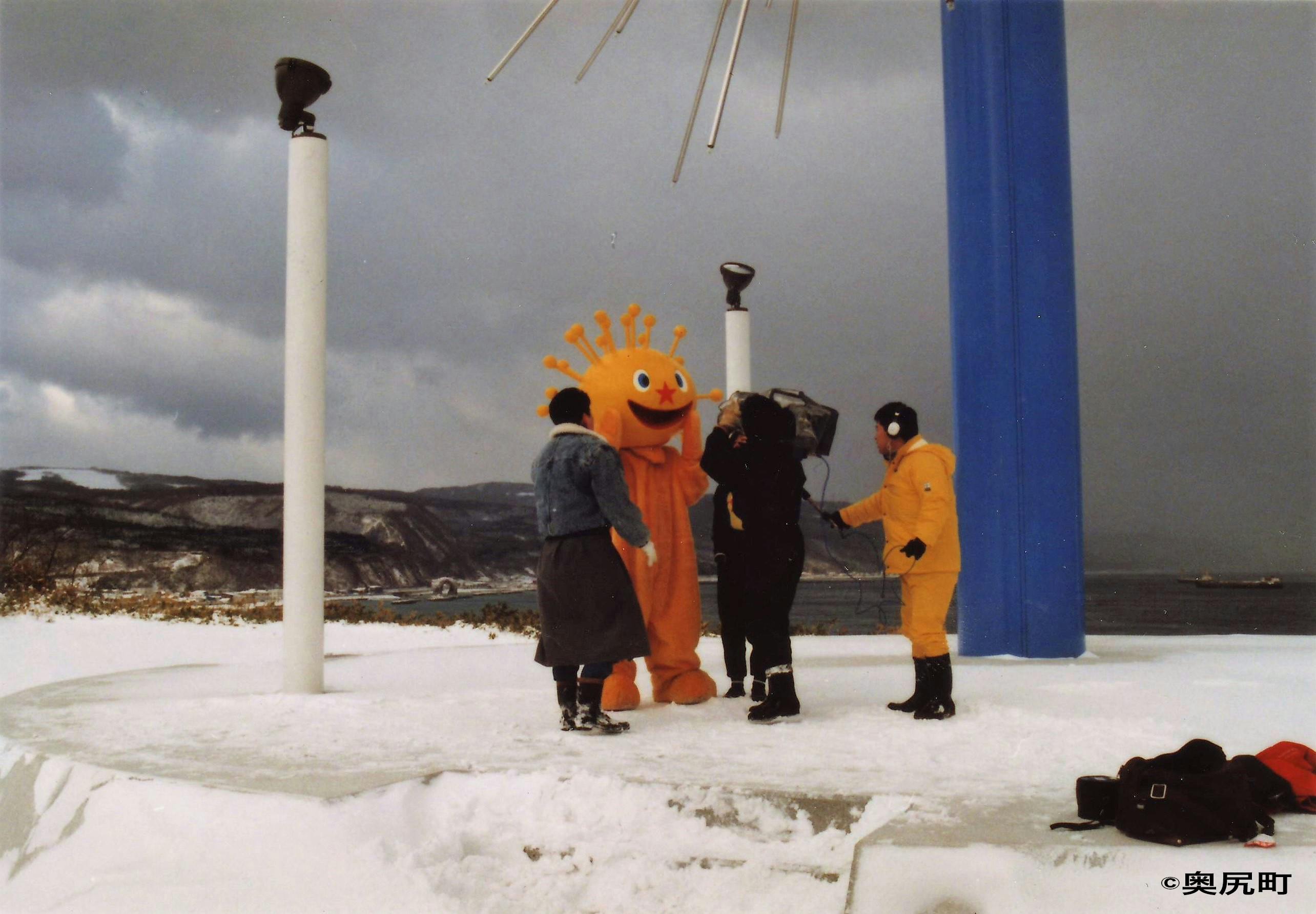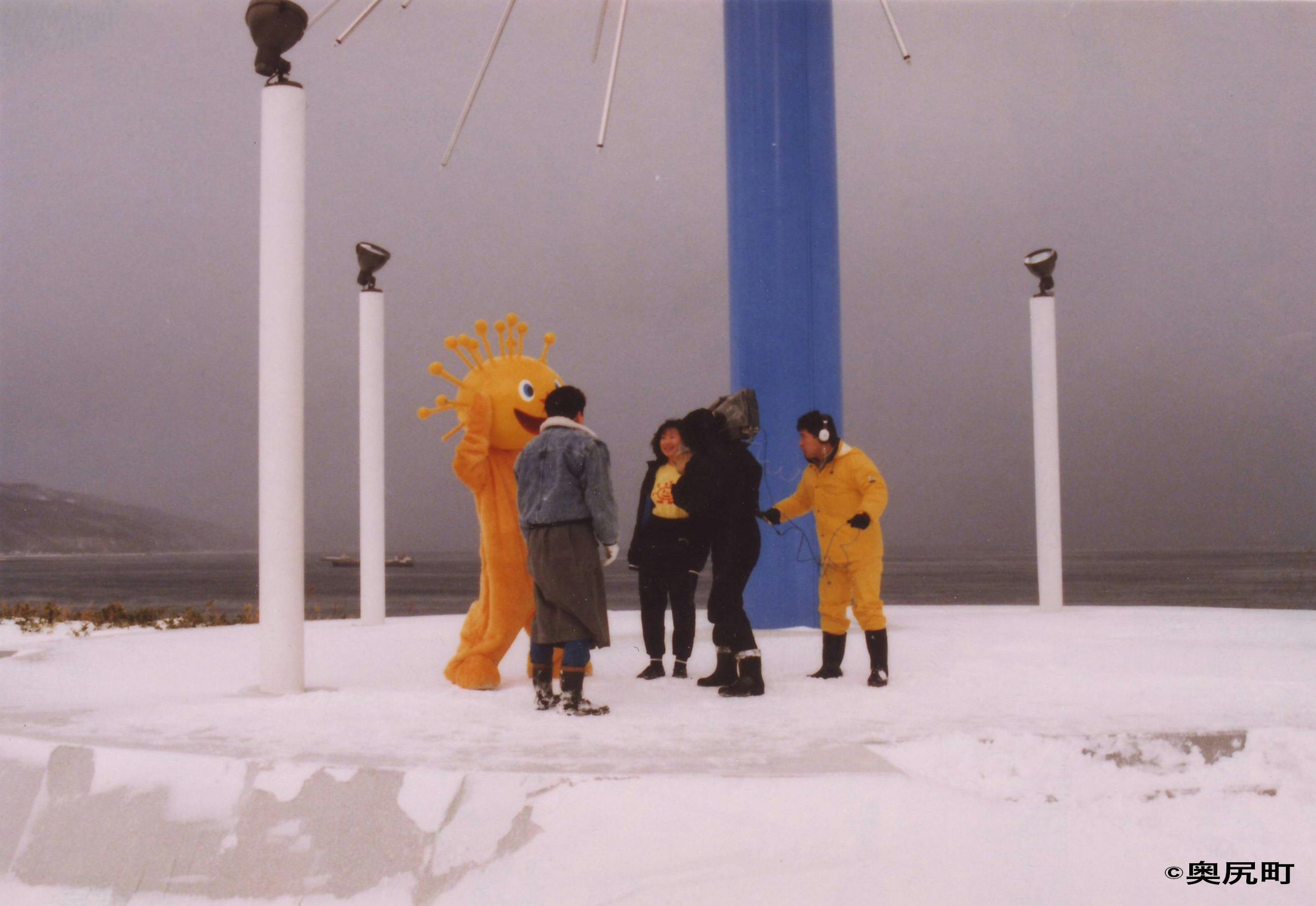 この写真は、「平成元年タイムカプセルうにまる事業」として、奥尻町が平成元年6月から平成2年3月にかけて「愛はおくしり島でめぐりあう」のキャッチフレーズで全国の皆さんから21世紀への愛のメッセージをお預かりし、2001年(21世紀)と2009年(1989年から20年後)に指定された方へお届けするという事業のプロモーションとして、使用したうにまるくんです!現在のうにまるくんと比べて、トゲの数がかなり多いですね!