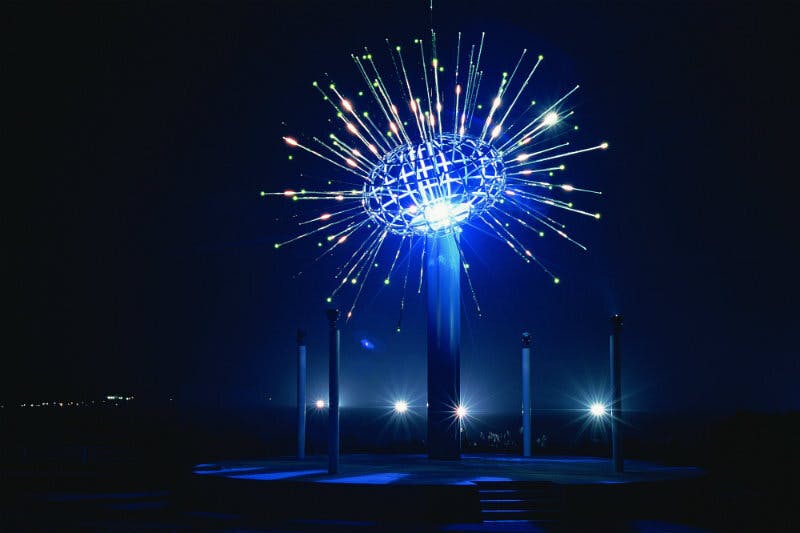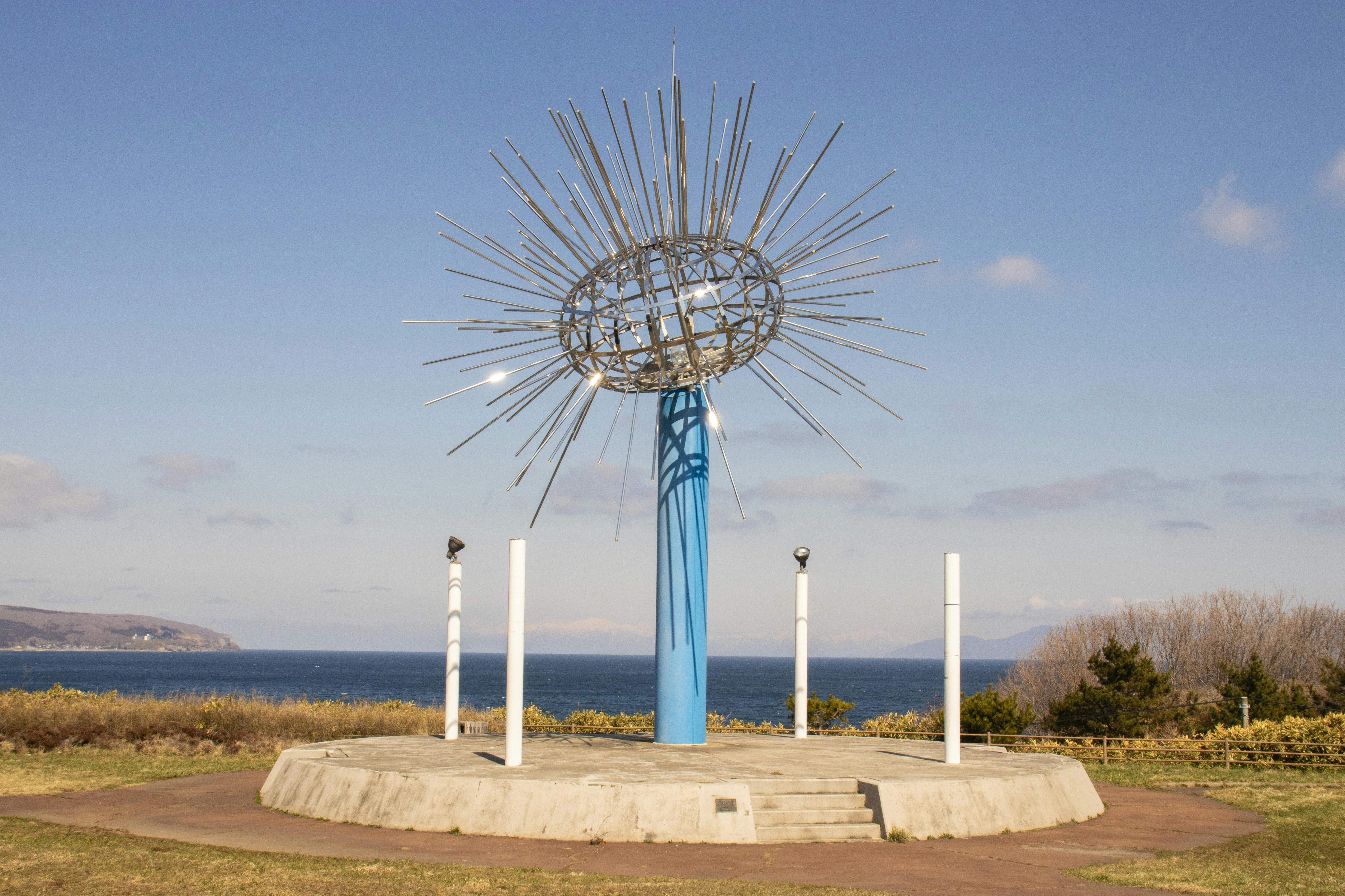 背景にあるのは、うにまるモニュメントです!このモニュメントは島の特産品である「キタムラサキウニ」をモチーフにしたモニュメントです!トゲの数は120本あり、夜にはライトアップします。