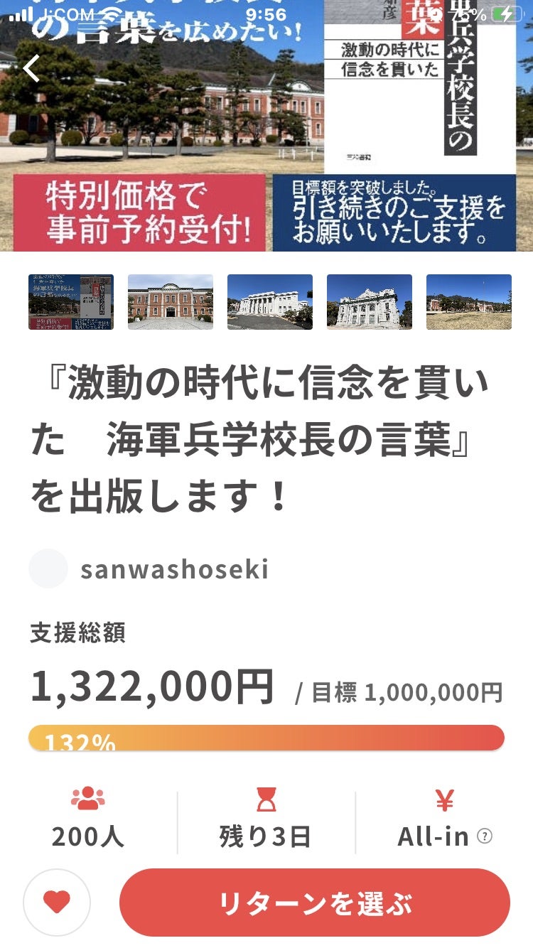 いよいよ残り3日となりました『海軍兵学校長の言葉』のクラウドファンディングですが、