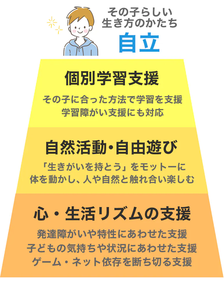 太陽学園では、不登校傾向や発達障がいのある児童・生徒に、勉強や対人関係など各成長段階に応じた課題を、マンツーマンでの学習指導や少人数によるソーシャル・スキルトレーニングなどの指導によって、よりきめ細かな療育支援を行っています。個々の個性や能力に合わせた指導方法(個別支援)で学び、自分のつまずきとうまくつきあいながら、自らの殻をやぶって自信を持ち、自立し、社会に参加・進出ができるためのサポートを行うことを最大の目標としています。