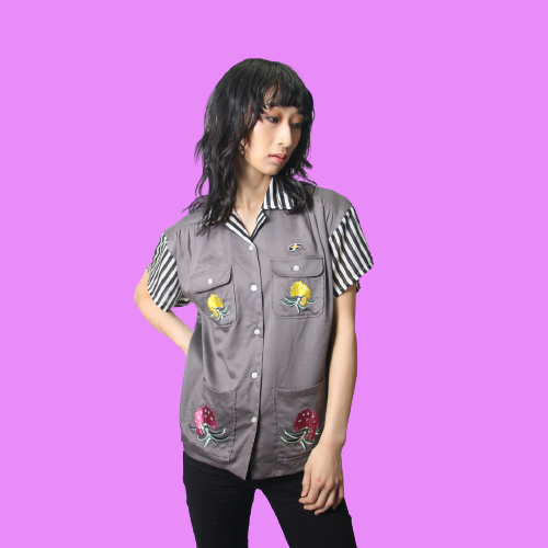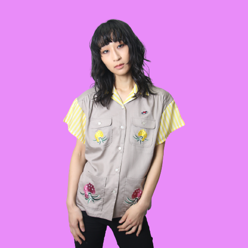 ↑群馬県伊勢崎の刺繍職人と作った花刺繍を施したレディースラグジュアリー開襟シャツ。生地から日本製の完全メイド・イン・ジャパンで希少生産品。初夏に向けアーティスティックかつクールビューティなスタイリングで着こなしたい。