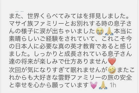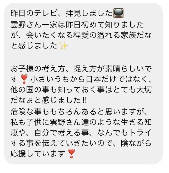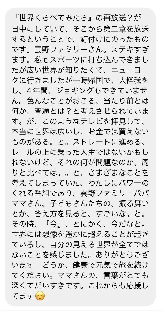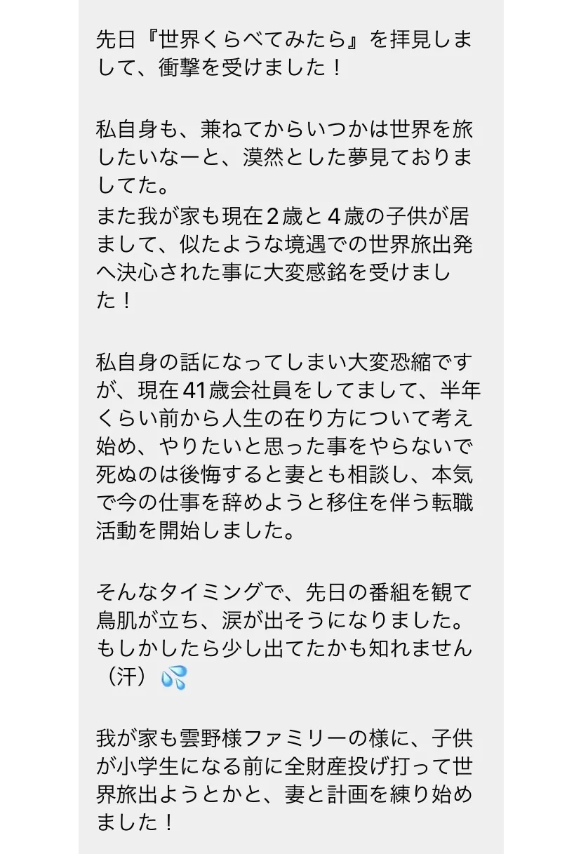 TBSで放送されている『世界くらべてみたら』を視聴された方やSNSのフォロワーさんから子連れ旅のことを知りたい、子どもの成長を見たい、生きる力をもらいました!と多くの応援、励ましの声をいただいております。