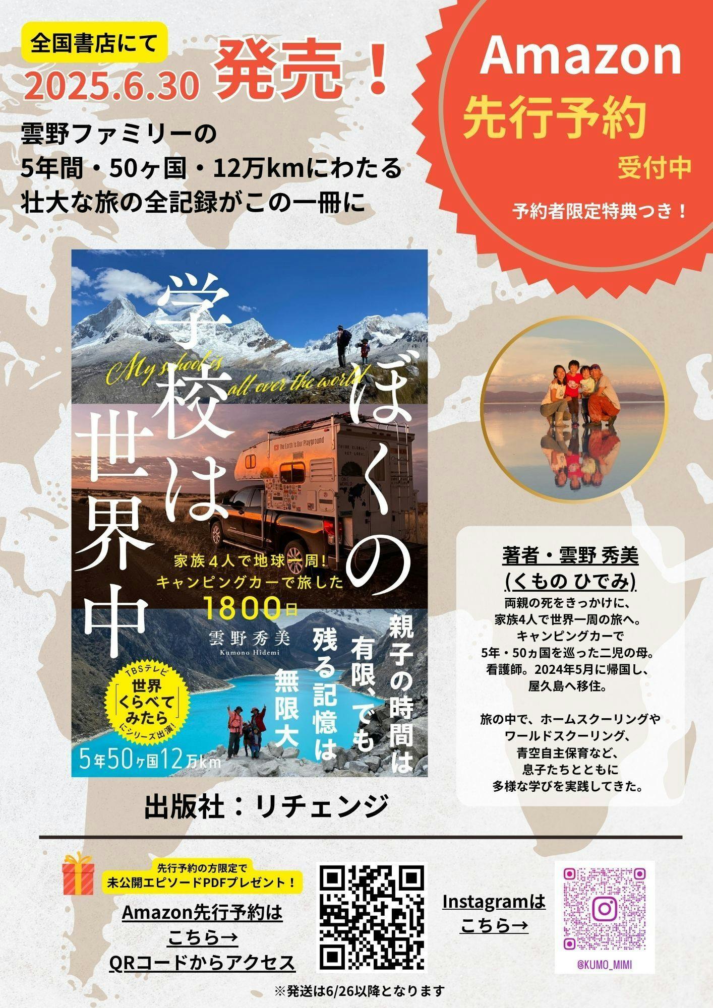 2025/05/12 16:04ご支援いただいた皆さまへこんにちは。雲野秀美です。まずは、当初の予定より約1年も出版が遅れてしまったこと、心よりお詫び申し上げます。長くお待ちくださった皆さまに、心から感謝いたします。その分、時間をかけて丁寧に仕上げた一冊が、ようやく形になります。書籍『ぼくの学校は世界中』は、リチェンジ社より6月30日に全国の書店で出版されることが決定しました!それに先立ち、Amazonでの予約受付もスタートしました。さらに、Kindle版(電子書籍)も販売予定ですので、紙の本・電子版どちらでもお楽しみいただけます。クラウドファンディングでご支援くださった皆さまには、6月下旬より書籍を順次発送予定です。そして今回、クラファン支援者の皆さまと、Amazonで先行予約してくださった方全員に、「未公開エピソードPDF」を特典としてお届けいたします。この未公開エピソードは、本当は本に載せたかったけれど、ページ数や構成の関係で泣く泣くカットした大切なエピソードたち。旅のハプニングや役立つノウハウなど濃い内容ばかりです。旅がもっと身近に感じられる、ワクワクが詰まった特典になっていますので、ぜひ受け取っていただけたら嬉しいです。完成まで長らくお待たせしてしまいましたが、旅の全てを込めた一冊になっています。お友達やご家族にシェアしていただけると大変励みになります。皆さまのシェアが、また新たな出会いやきっかけにつながっていくことを願っています。Amazon先行予約はこちらとなります。https://www.amazon.co.jp/dp/4434346989なお、日ごろの屋久島での暮らしや息子たちとの日常、出版に関する最新情報やイベントのお知らせなどは、各種SNSで発信中です。よろしければ、ぜひフォローしてのぞいてみてください。■Instagram:https://www.instagram.com/kumo_mimi■X(旧Twitter):https://twitter.com/RunKamakuraあらためまして、長きにわたる応援に心より感謝いたします。今後ともどうぞよろしくお願いいたします。感謝を込めて雲野秀美 もっと見る