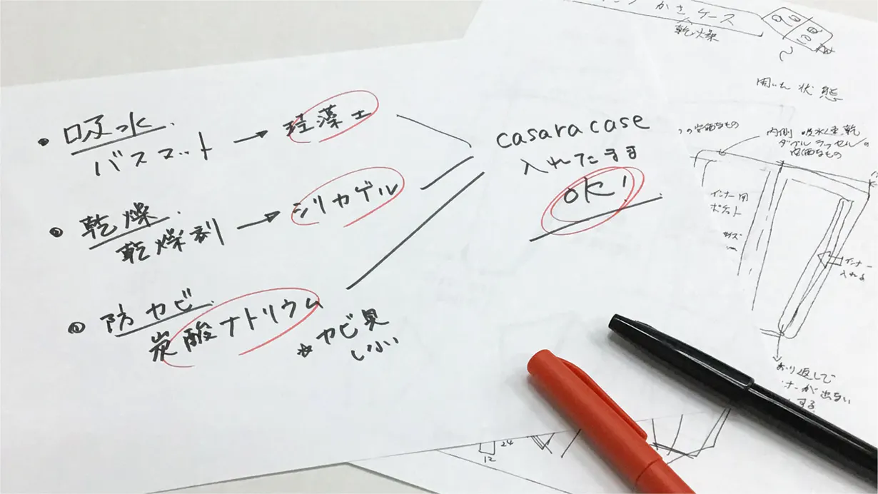 バスマットでおなじみの珪藻土と乾燥剤に使われるシリカゲルが水分をしっかり吸収。粉体のまま封入することで、表面積を広げました。その広さがそのまま吸水性能を高め、薄さと吸水力の両立を実現しています。もちろん珪藻土にアスベストは混入していません。