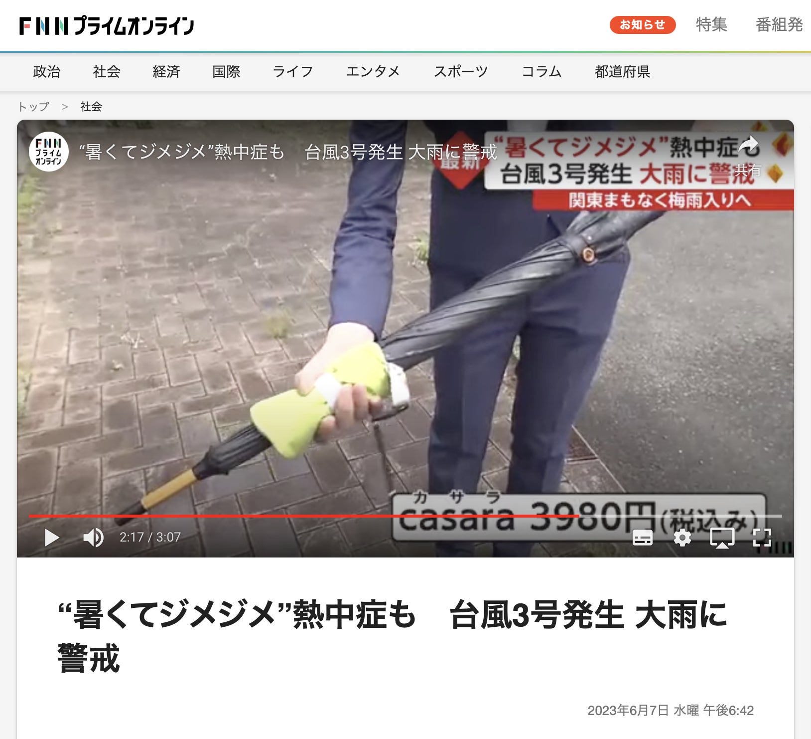 3秒傘拭きcasara フジテレビNEWSイット! で紹介されました!本格的な梅雨に入り、雨の中快適し過ごすための製品として紹介いただきました!その他日本テレビ・讀賣新聞等でもお取上げいただきました。是非ご覧ください!https://techno-gateway.com/latest-information/