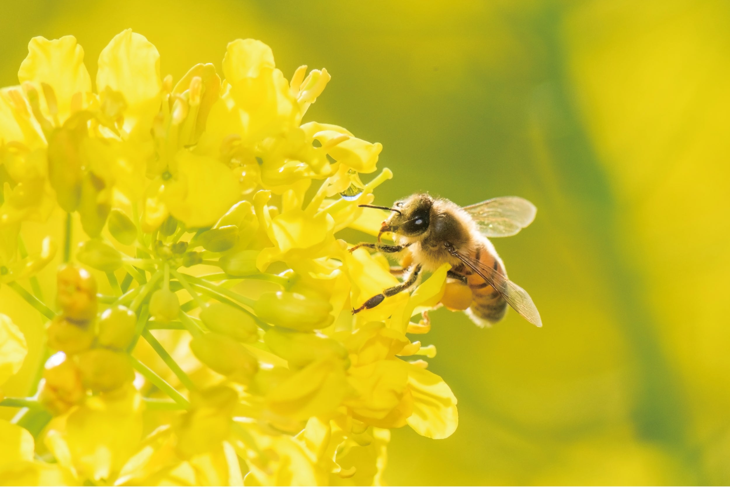 ミツバチの餌は「花蜜」と「花粉」。花蜜は人間にとっての主食、花粉はタンパク質やビタミンです。ミツバチも生きる上で栄養バランスが重要になってきます。