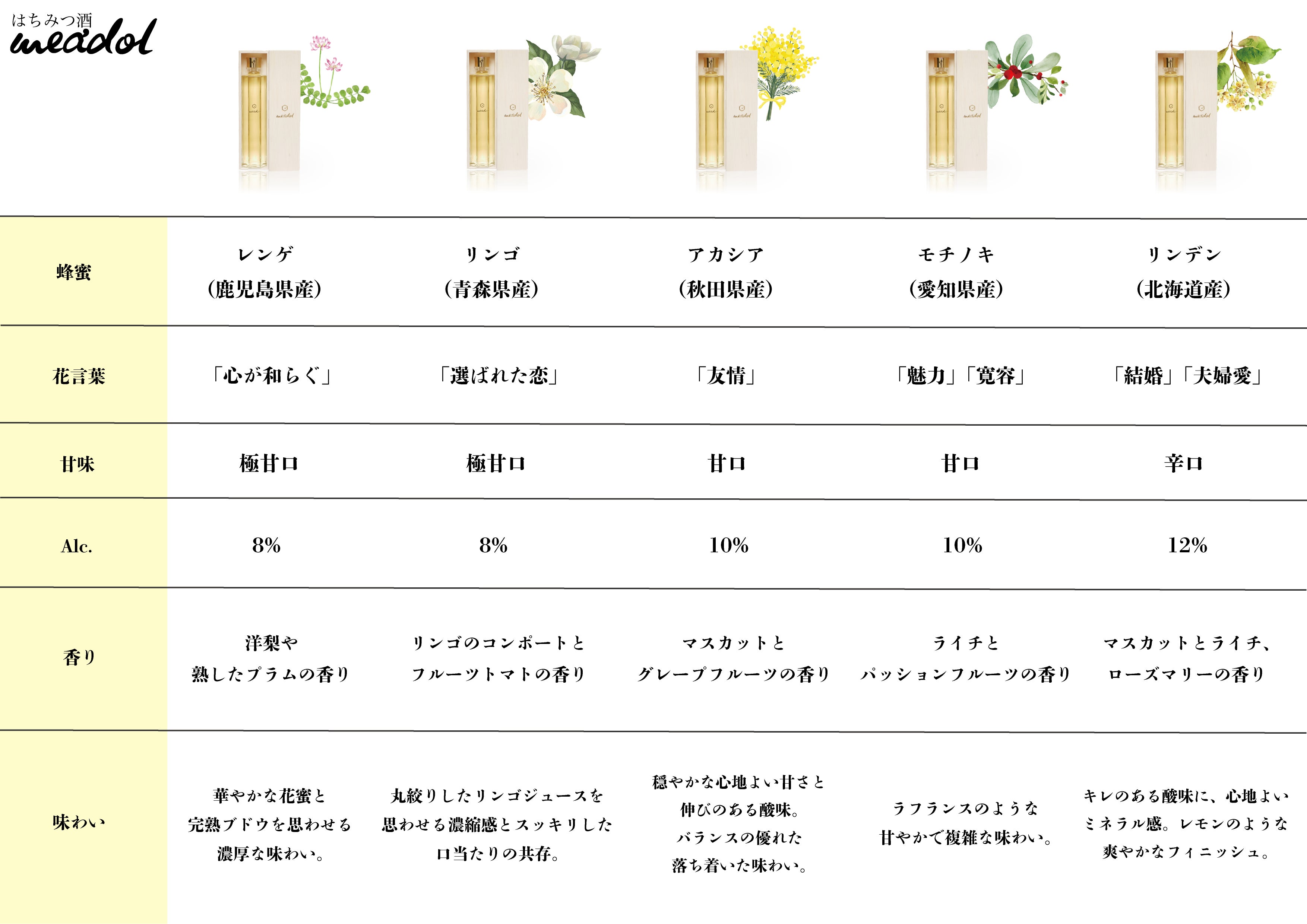 現在、meadolは5種類の商品を販売しております。種類ごとに異なる単花蜜を使用し、それぞれはっきりとしたキャラクターを生み出しています。