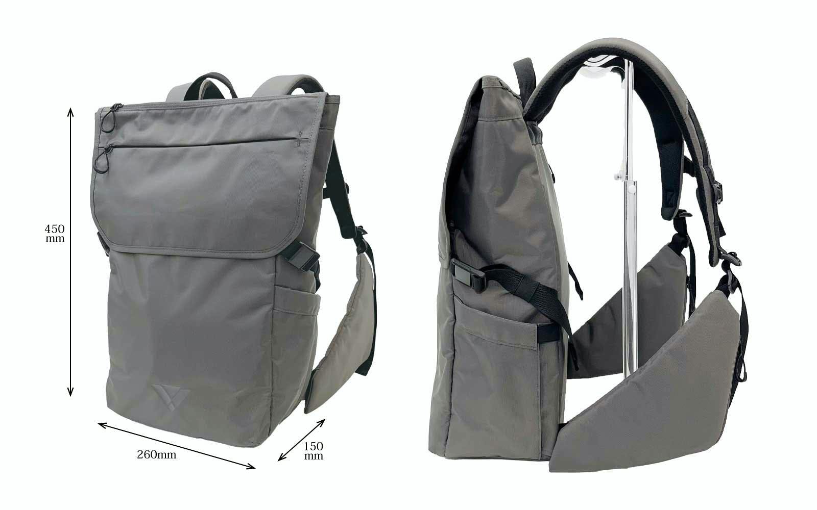 背負ったままですぐに手の届く便利な両翼ポケットを備えたフラップスタイルのリュックサック。可動式ウイングポケットで、ショルダー調整ベルトの範囲内でポケットの位置を移動・固定ができます。
