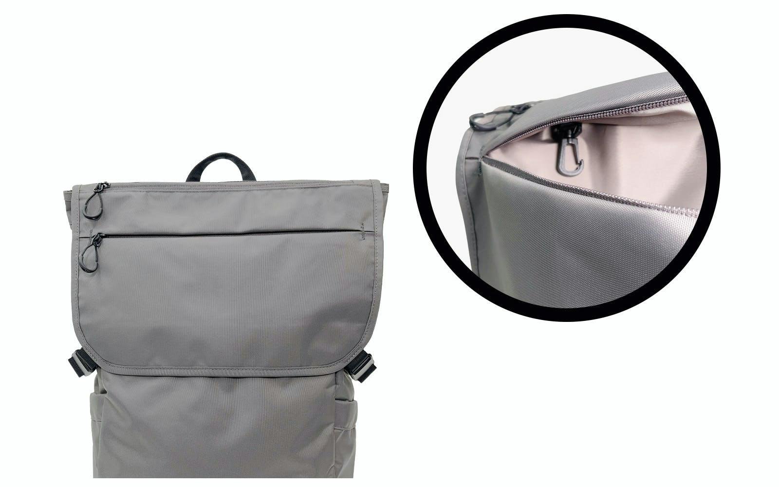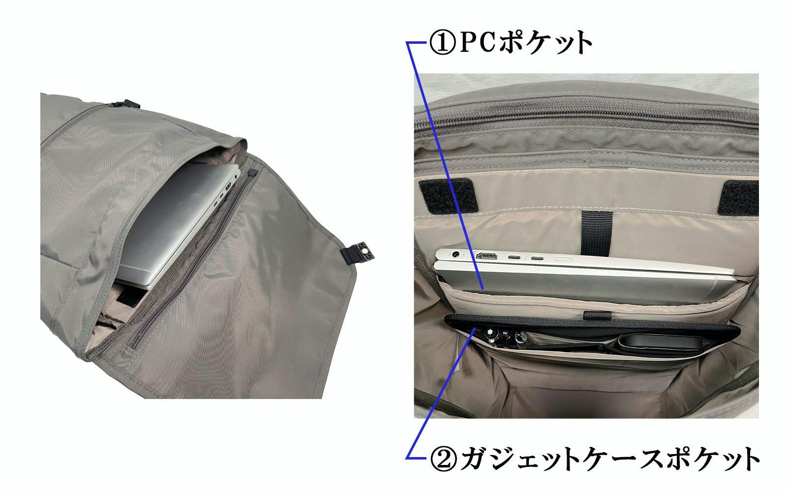 フラップTOPファスナー、背面サイドファスナーの2か所からアクセス可能なPC専用ポケット