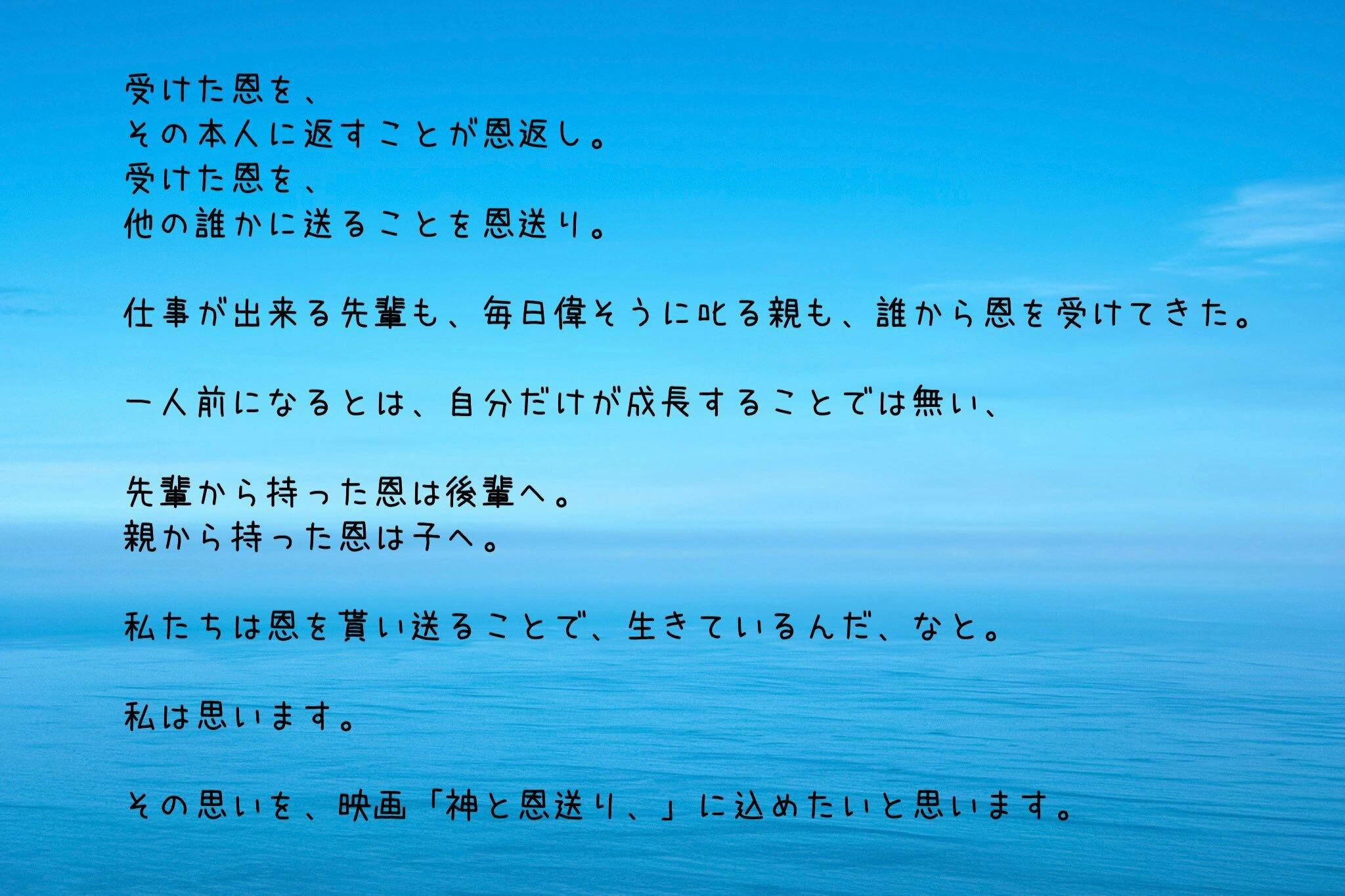 その思いを、映画「神と恩送り、」に込めたいと思います。