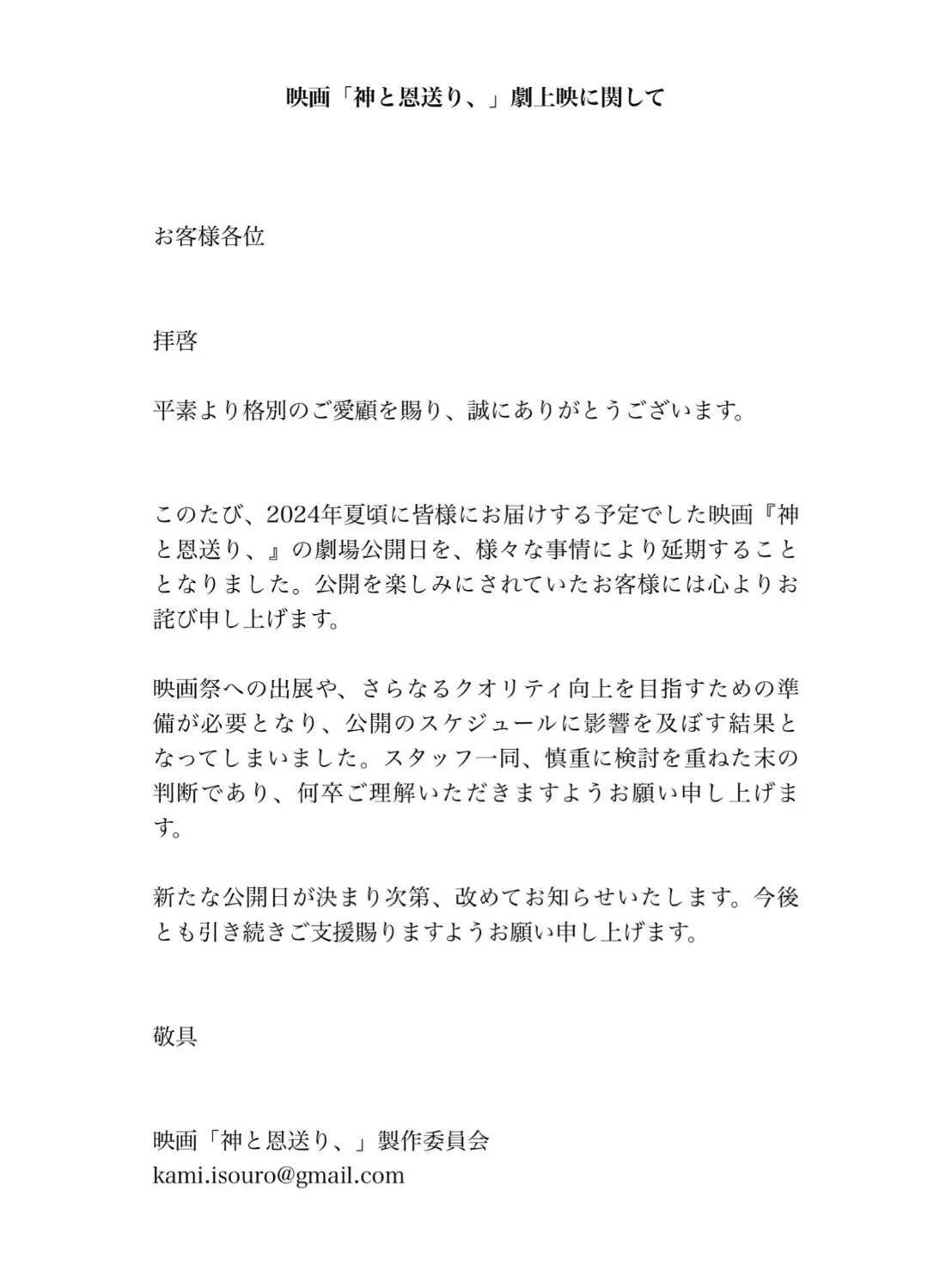 このたび、2024年夏頃に公開予定の映画『神と恩返り、』の劇場公開日の延期が決定いたしました。