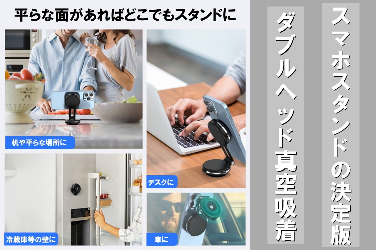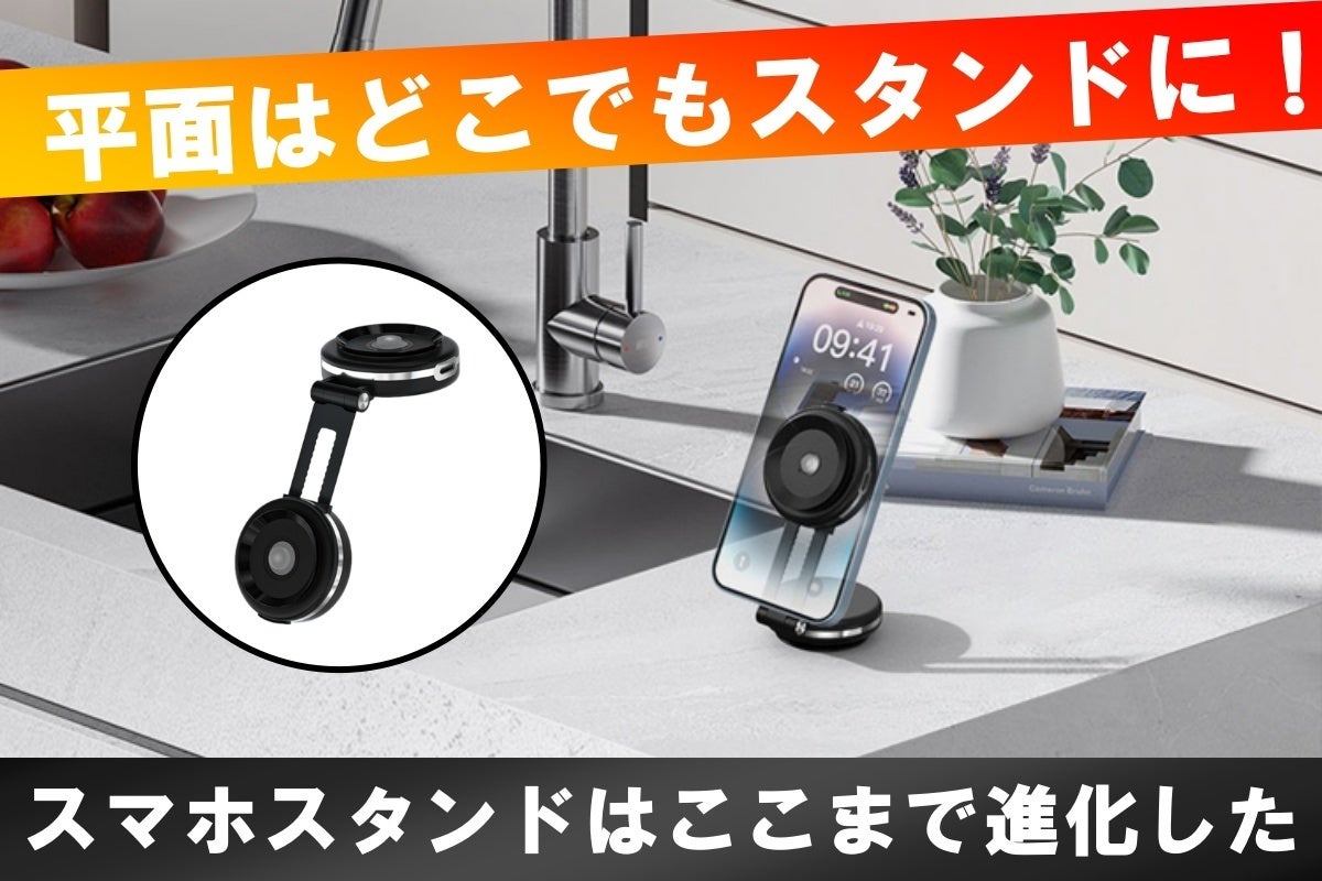 2個の真空吸着ホルダーの力でタブレットPCやスマホを保持しどこでもスタンド化出来る、独創的な真空吸着型のスマホホルダーです!