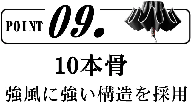 強さと軽さのバランスがある10本骨タイプです。親骨は軽量で丈夫なグラスファイバーを使用され、耐久性に優れた防風構造になっています。