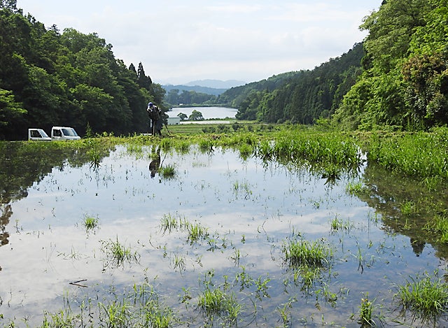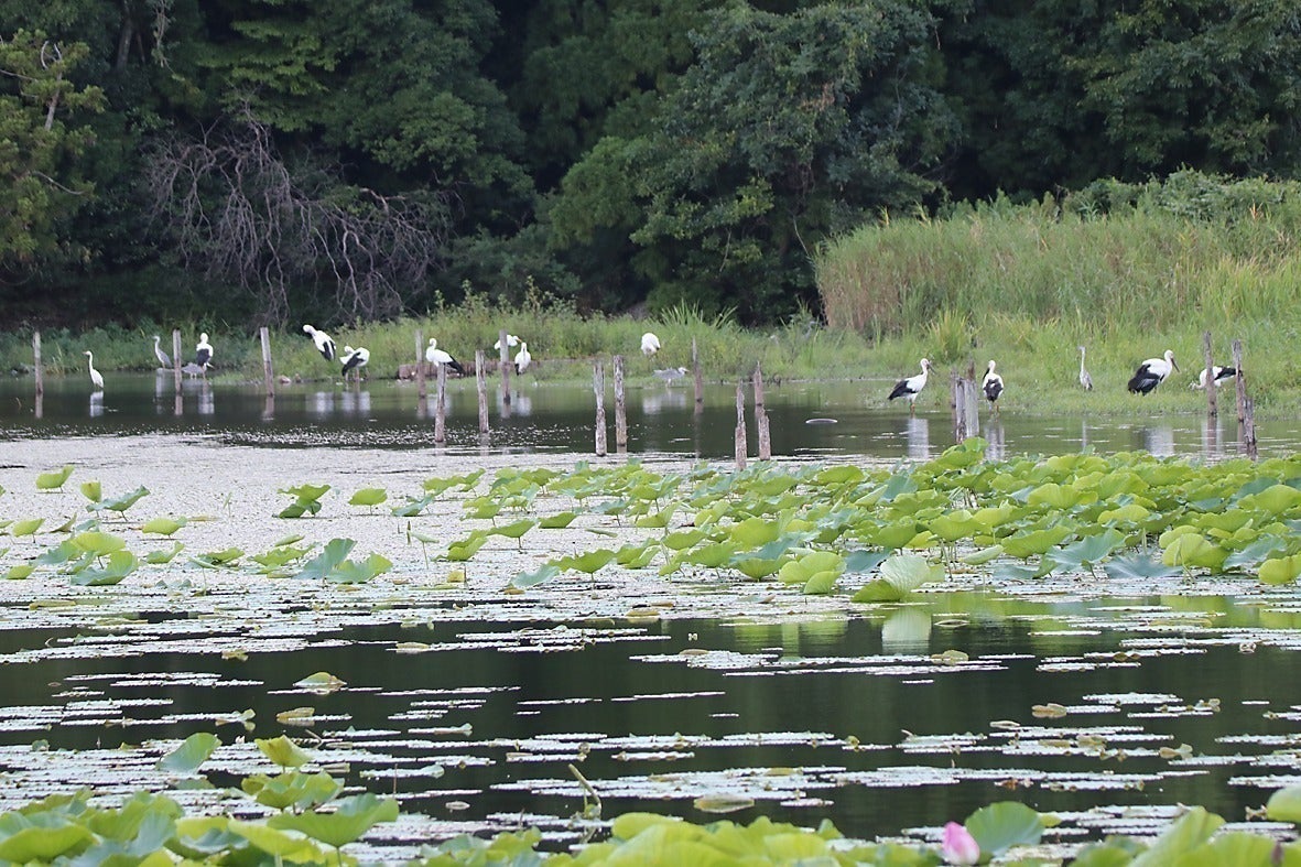 私たちの地域には近年多くのコウノトリが飛来し、早春から晩秋にかけここで暮らしていますが、田んぼの水が抜かれる頃になると故郷の豊岡などに帰ってしまいます。おそらく、餌となるドジョウやカエルが捕れなくなるのが原因と考え「コウノトリ食堂」と名付けたえさ場作りを進めています。谷間に切れ込んだ棚田(休耕田)6面を借り受け、老体にむち打って背丈を超えて生い茂った雑草や灌木を刈り、谷川の水を引いて人工湿地を作りました。ただ、山を背にした棚田の最上段であるため、ここにコウノトリが来ているのか否か、確認ができていません。