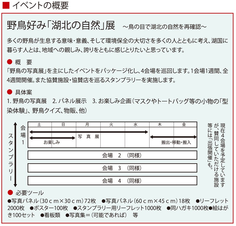 具体的には、地域に生息する野鳥を紹介する写真や野鳥写真家の自慢の写真等のパネル展示を主に、野鳥をモチーフにした小物作り、野鳥クイズなどの「お楽しみ企画」、地元農水産物の販売などをパッケージ化していくつかの会場を巡回して開催するものです。現在湖北地域の「道の駅」4カ所に参画していただいています。また、ご依頼があれば出張開催も視野に入れています。当クラウドファンディングでのご協力金は、イベント開催にかかるパネル制作ほか諸々の経費として使わせていただきます。