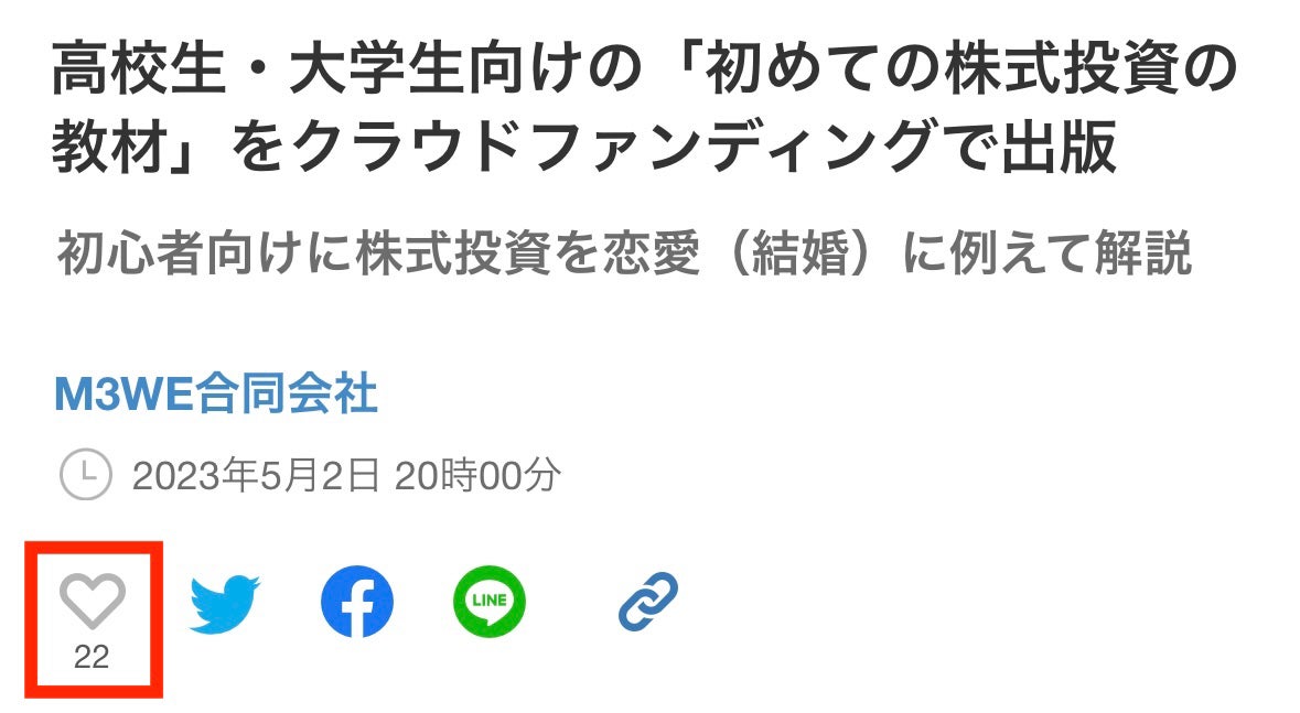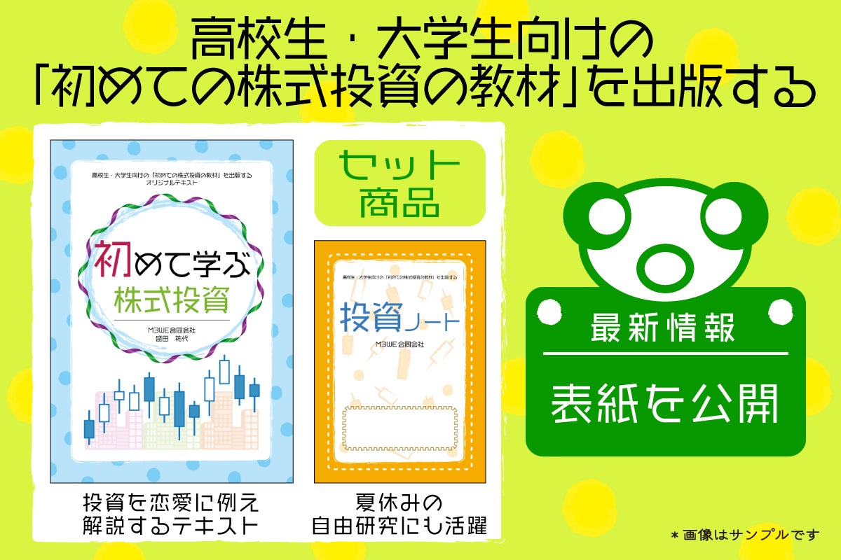 2023/07/24 11:00M3WEの盛田 祐代です。この度は、本プロジェクトにご支援・応援いただき、誠にありがとうございました。皆様のお気持ちが本当に励みになりました。無事に本が完成しましたので、7月21日に「高校生・大学生のための初めて学ぶ株式投資」の一般販売に関するプレスリリースを行いました。プレスリリースプレスリリースのリード文より(抜粋)本書は、株式投資に興味を持つ高校生及び大学生を対象にした投資の入門書です。老後に向けた資産形成を目的とするだけではなく、投資で得た情報を就職や起業に活用する点にまで踏み込んだ新しいタイプの投資の本です。株式投資をすると、経済をはじめ、世界の様々なビジネスモデルや経営者を知ることになります。例えば経営者が今起きている問題にどのように対応しているかも把握することができます。このような情報は、彼らが就職・起業した際に役に立つでしょう。銘柄選びや売買は、恋愛を事例に解説しました。なぜなら恋愛と投資の判断が似ているからです。例えば売りタイミングは「恋人の別れ」、分散投資は「一夫多妻制」でご紹介。株価チャートの分析も解説しています。新しいタイプの投資の本・目次「目次を見ると普通の投資の本と全然違うね」と感じられるかもしれません。しかし投資の知識は難しく学ばなければいけないということはないのです。初めて株式投資を学習するなら難しいより楽しい方がいいのではないでしょうか。記事ページ・株式投資とはなぜ世の中に株式投資が必要なのでしょうか。それがないとどうなるのでしょうか。その理解を深めることで株式投資がギャンブルではないということがわかります。・売りのタイミング株式投資をする時、売買のタイミングはとても重要です。「売り」については、「恋人との別れ」を事例に解説しました。・分散投資分散投資は、一夫多妻制を例に取り上げました。日本では一夫多妻制は禁止ですが、もし株式投資を行う上で1銘柄に集中投資したらリスクが大きくなります。そのあたりについても丁寧に解説しました。メッセージ私の元上司でもあり、本書の校正を担当した元週刊ゴールデンチャート編集長 湯山 澄夫氏(有限会社教文社代表取締役)よりメッセージをいただきました。ーーー若い人達にとって投資を始めることは、未来の幸福を買うという事だと思います。私が大学生の頃はまだアップルやマイクロソフトは、パソコンというマニア向けの小型ボードコンピュータに、当時大型汎用コンピュータ主流だったビジネス電算業務のシステムを搭載できるようにした画期的な動作環境を発表したばかりでした。私はこのOSを動作させるプログラミングに没頭しても、自分が大ファンの会社の株に投資しようなんて思いませんでした。あの頃の私が本書に出会っていたら、今頃私は億万長者でした。みなさんぜひ今から創業したばかりの天才経営者の会社に投資を始めて下さい。ーーーご予約受付中ご予約はこちら*個人の方も1冊からお求めいただけます。ただし、環境に配慮し弊社では在庫を持たない仕組みで出版しますので、納品までに2〜3週間かかります。*クラウドファンディングで作成したものを少しだけ改良して一般販売します。掲載する記事は同じですので、クラウドファンディングでお求めになった方がこちらをご利用いただくと同じものが2冊手元に届く形になります。ご注意ください。 もっと見る