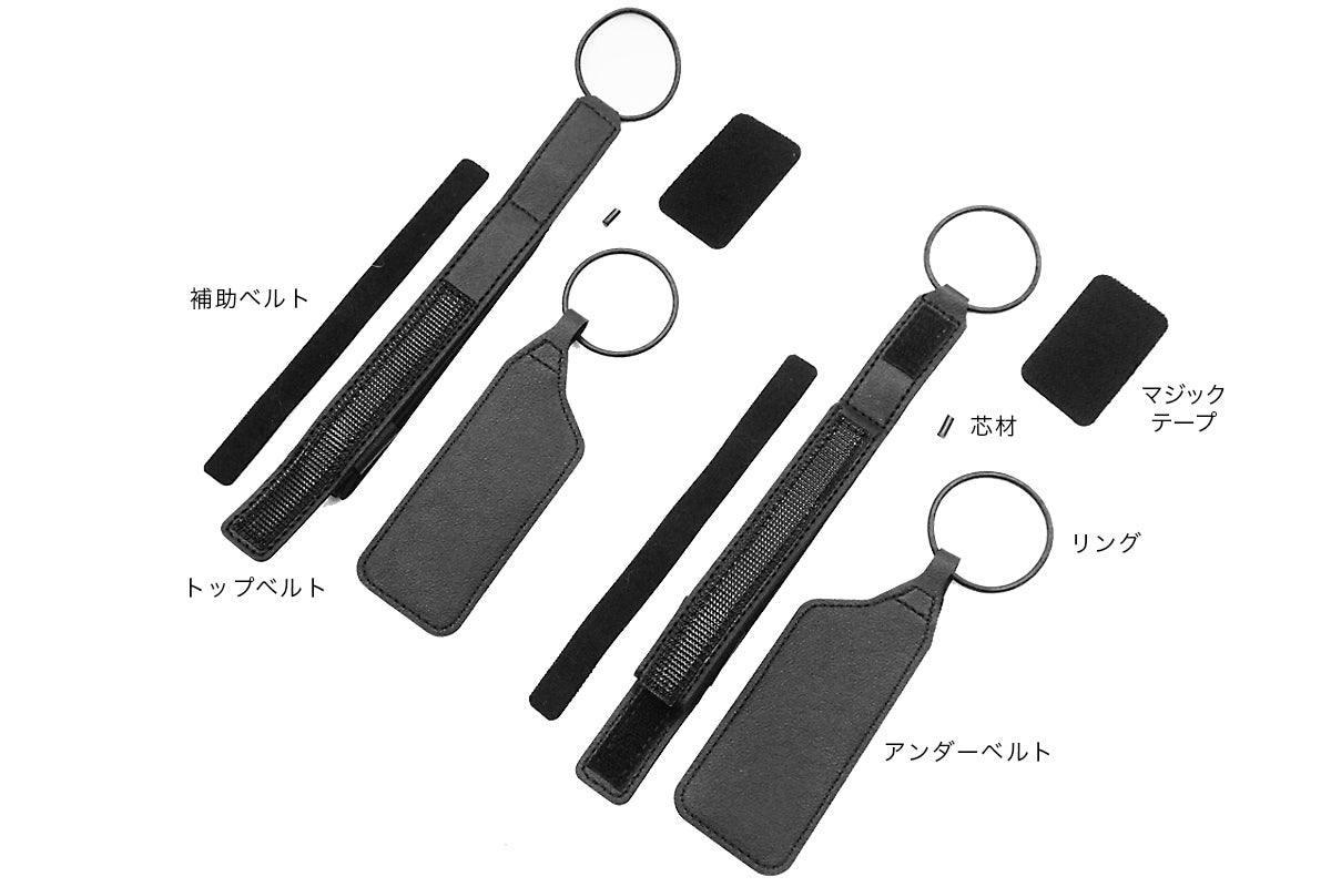 ● サイズ:トップベルト/全長約W20×H240(リング含む)×D4mm、アンダーベルト/全長約W40×H150(リング含む)×D4mm、補助ベルト/約W12×H145×D1mm、マジックテープ/約W30×H50×D2mm