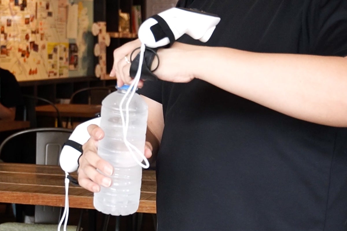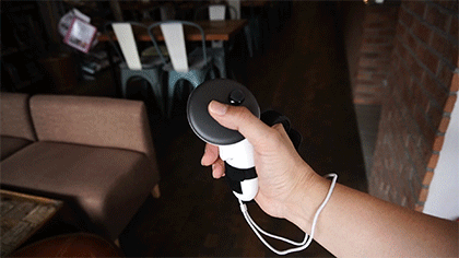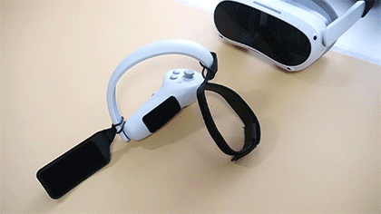VRゲーム中、現実世界のモノを掴むには、コントローラーを一度机上に置いたり、手首のストラップを使ってぶら下げたりしないとモノがつかめません。視界が悪くなるVRゴーグル中は、こういう動作がとてもめんどくさい・・