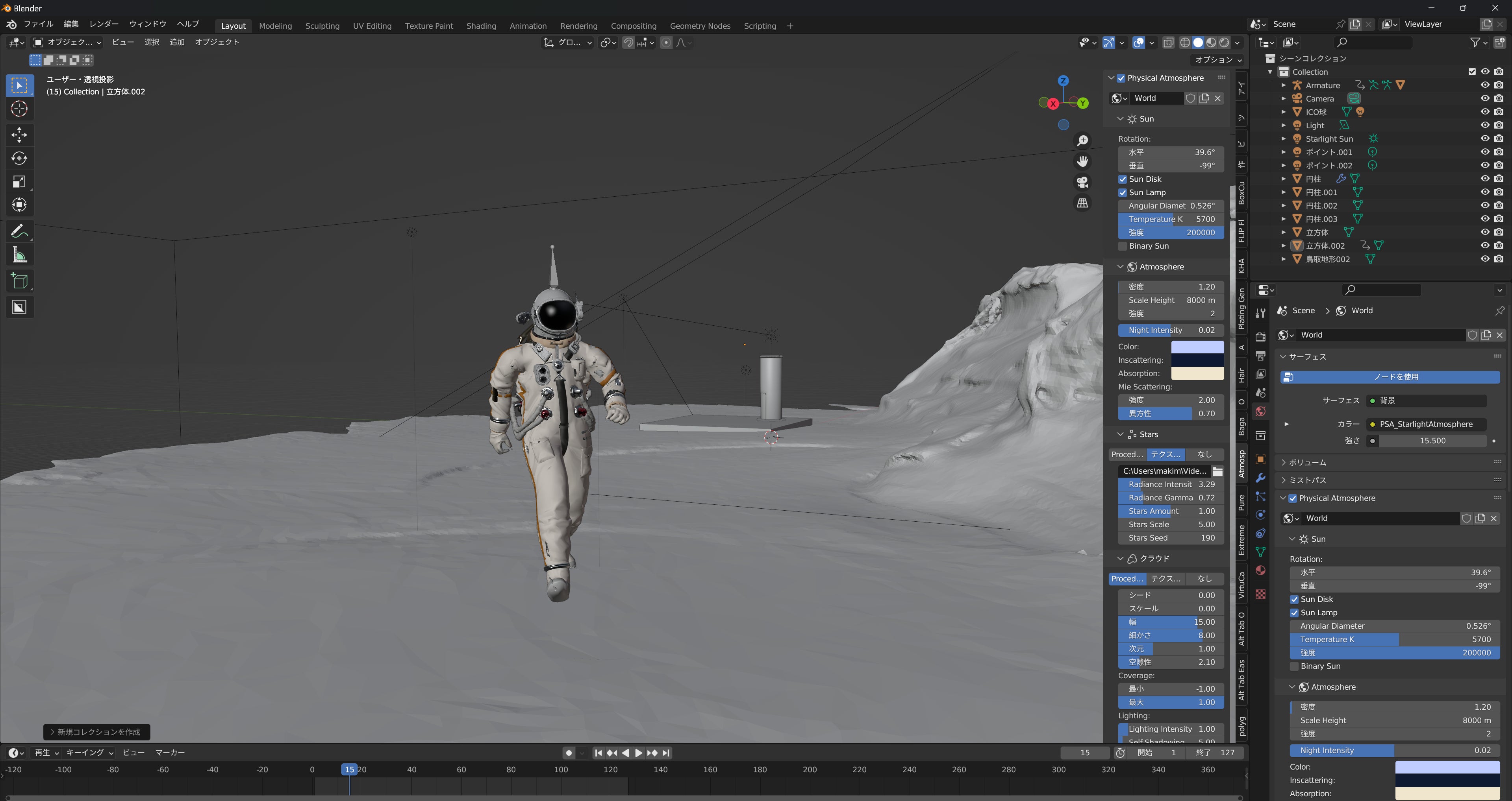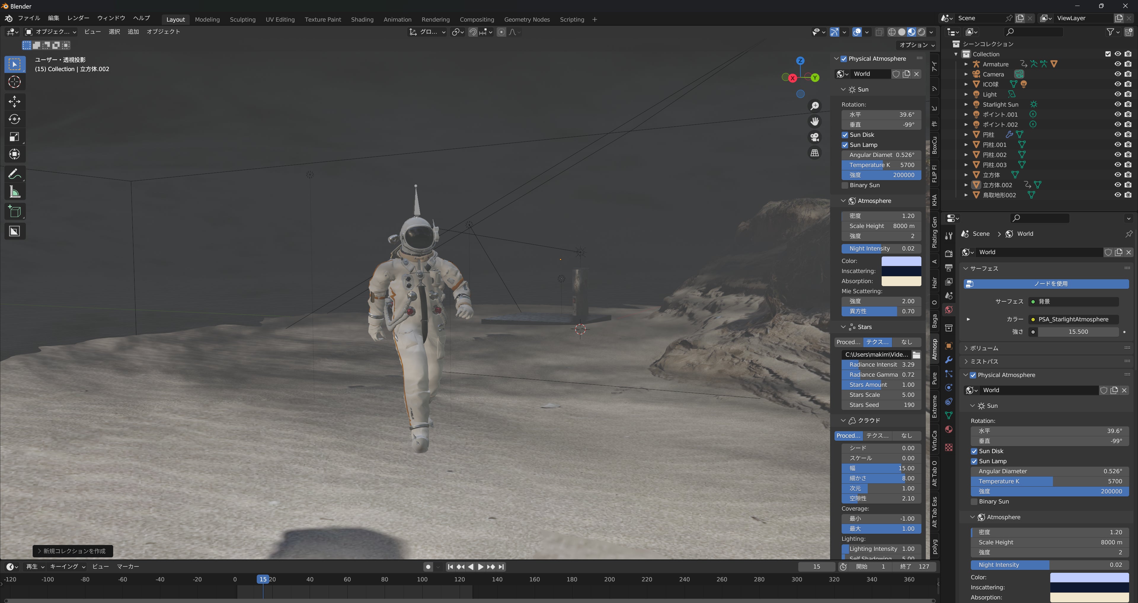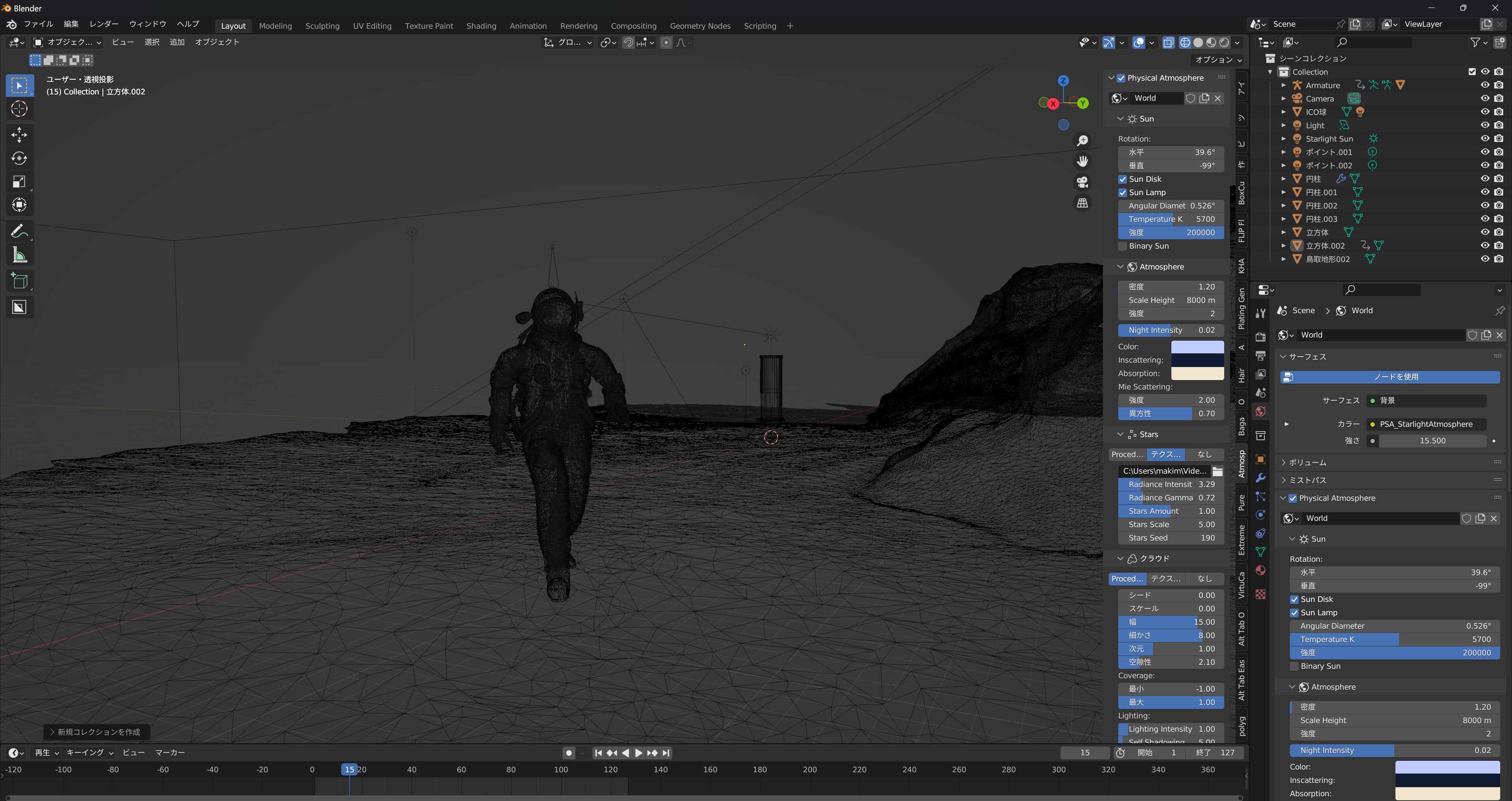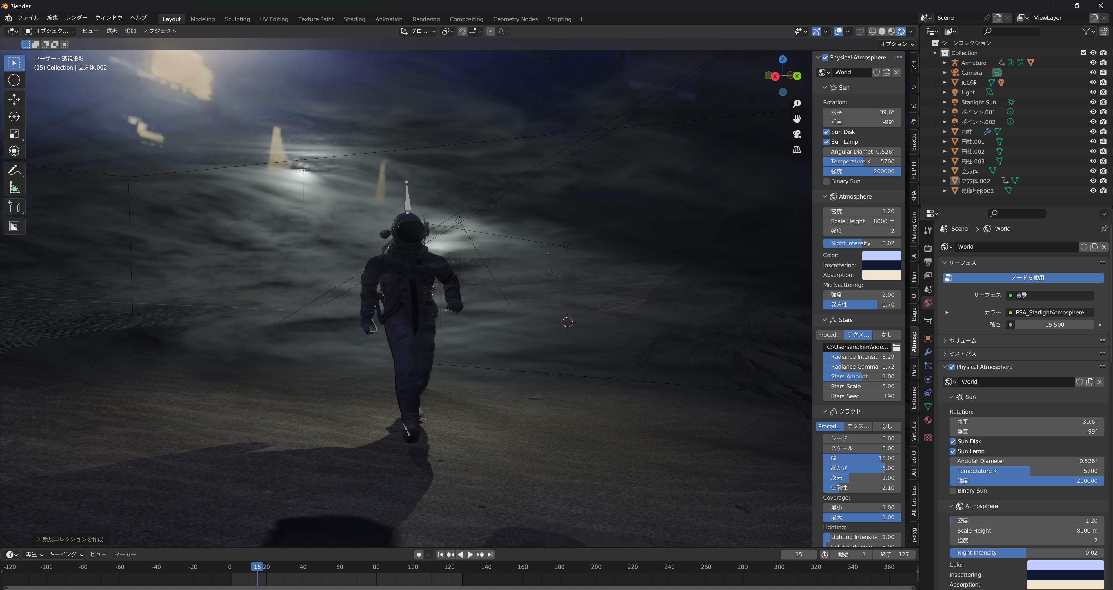 全て同じシーンの同じカットの制作画面ですが、制作段階に合わせて見え方を変えながら編集してます!一番下の写真(レンダービュー)が本編で使用されるものです。