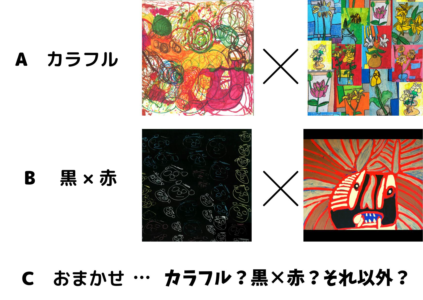 A カラフル B 黒×赤 C おまかせの3種類からお選びいただけます。