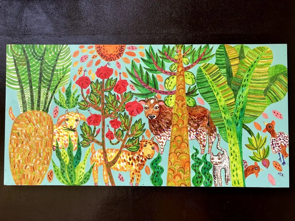↑カフェ入口のカラフルな絵画は、砂山ビーチ近くにある「福木カフェ」のオーナーAYAさんの作品。当時、まだジャージー牛は居なかったけれど、絶対に迎え入れるという決意を込めて、先に描いていてもらっていました。