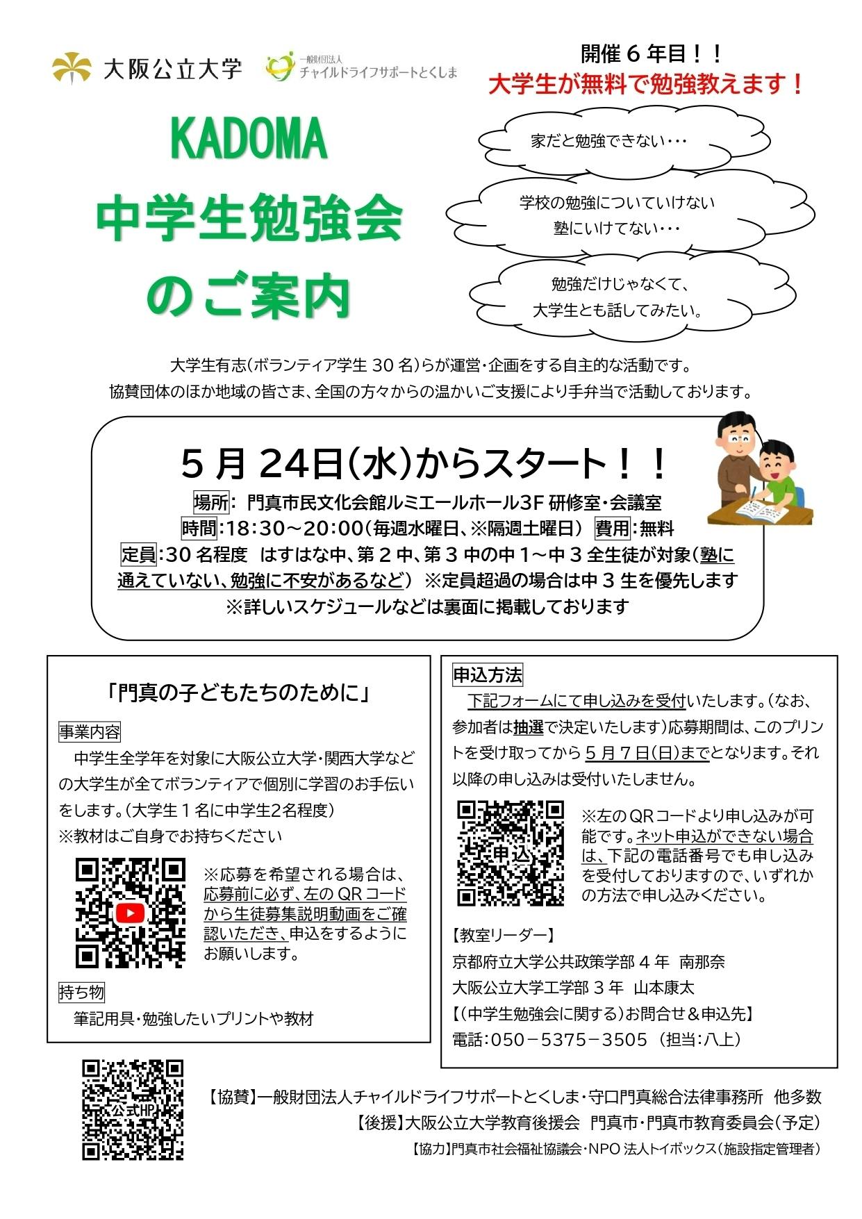 私たちは、大阪府門真市で市内の中学生を対象に無料の居場所・学習支援事業を実施しているKADOMA中学生勉強会(大学生ボランティア団体)です。2018年10月に門真市出身の大学生(当時、大阪府立大学4年)らの手弁当でスタートし、地元・門真の子どもたちが「どんな環境に生まれても「学べる」居場所」を創ることを目的に、この5年間国や自治体からの支援を受けず活動を続けてきました。また、2020年2月以降に発生した新型コロナの影響で、市内の子どもの居場所(子ども食堂等)も激減をする中、工夫をしながら歩みを止めずに門真の子どもたちに光を当て続けてきました。過去5年間で延べ4000名を超える生徒たちを支援してきました。