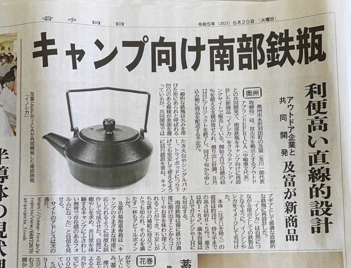6月17日より開始した当プロジェクトが開始6日の昨日、100%目標達成いたしました。ご支援、ご注文いただき誠にありがとうございます。及富さんと作り込んだプロジェクトが完成し、多くの皆様に評価していただき大変うれしく思っております。イノシカはキャンプやソトアソビだけでなく、お家時間でも活躍する鉄瓶です。特別な雰囲気の場所、日常とどちらにも素敵な時間をもたらしてくれます。南部鉄の醸し出す雰囲気をより多くの方に伝えるため、PR活動をさらに頑張っていきます。ネクストゴール200%を目指します。引き続き応援のほどよろしくお願いいたします。EFRICA 中嶋