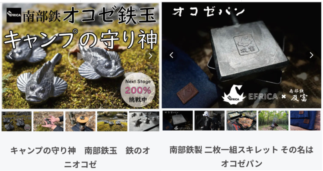 共同開発の第1弾としてマタギたちが御守にしたオコゼの干物を模した”オコゼ鉄玉”を作製し、クラウドファンディングにて販売を開始。目標の200%に迫るご支持をいただきました。また第2弾、2枚1組のスキレット”オコゼパン”もキャンパーを中心にご注文をいただき124%でゴールいたしました。