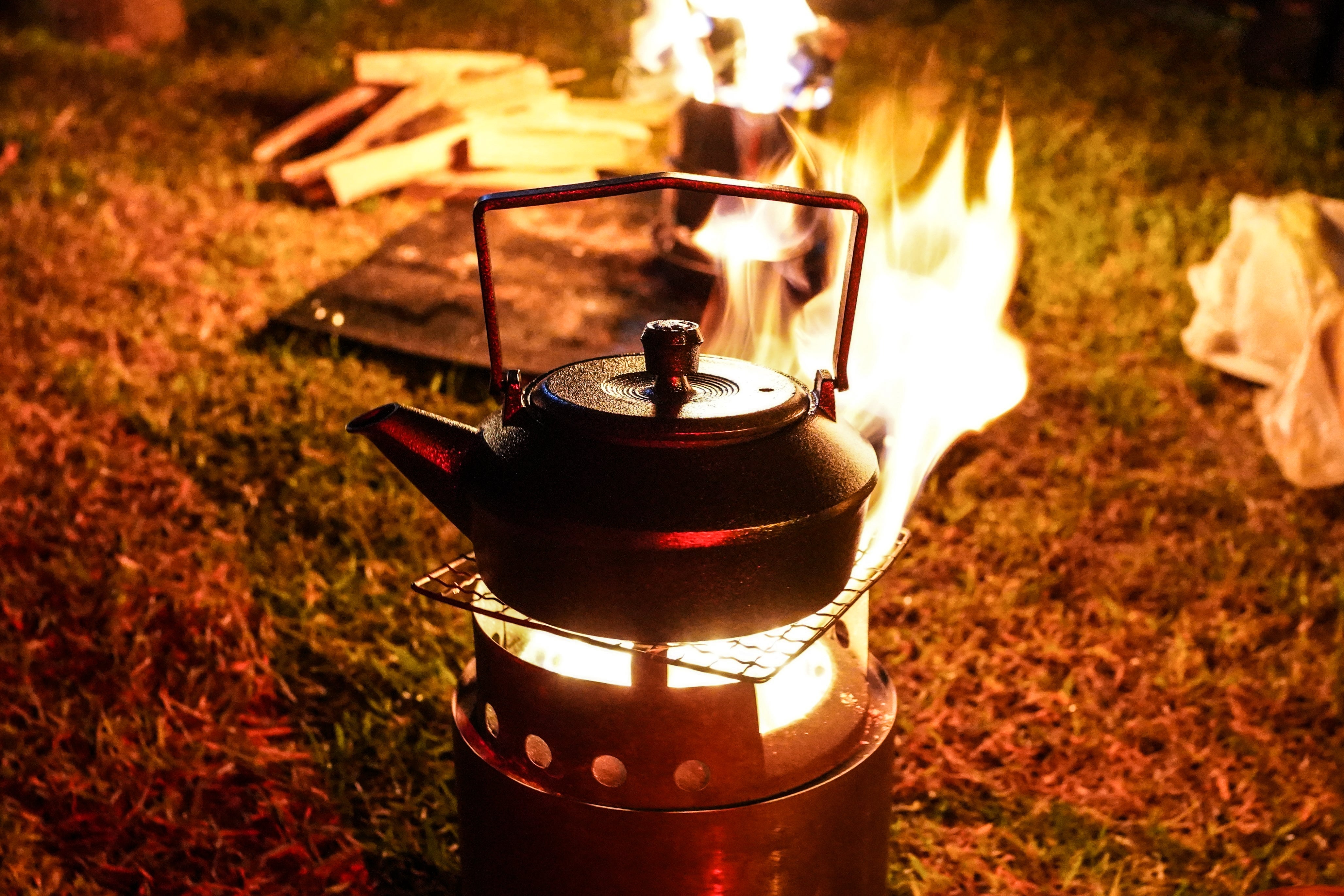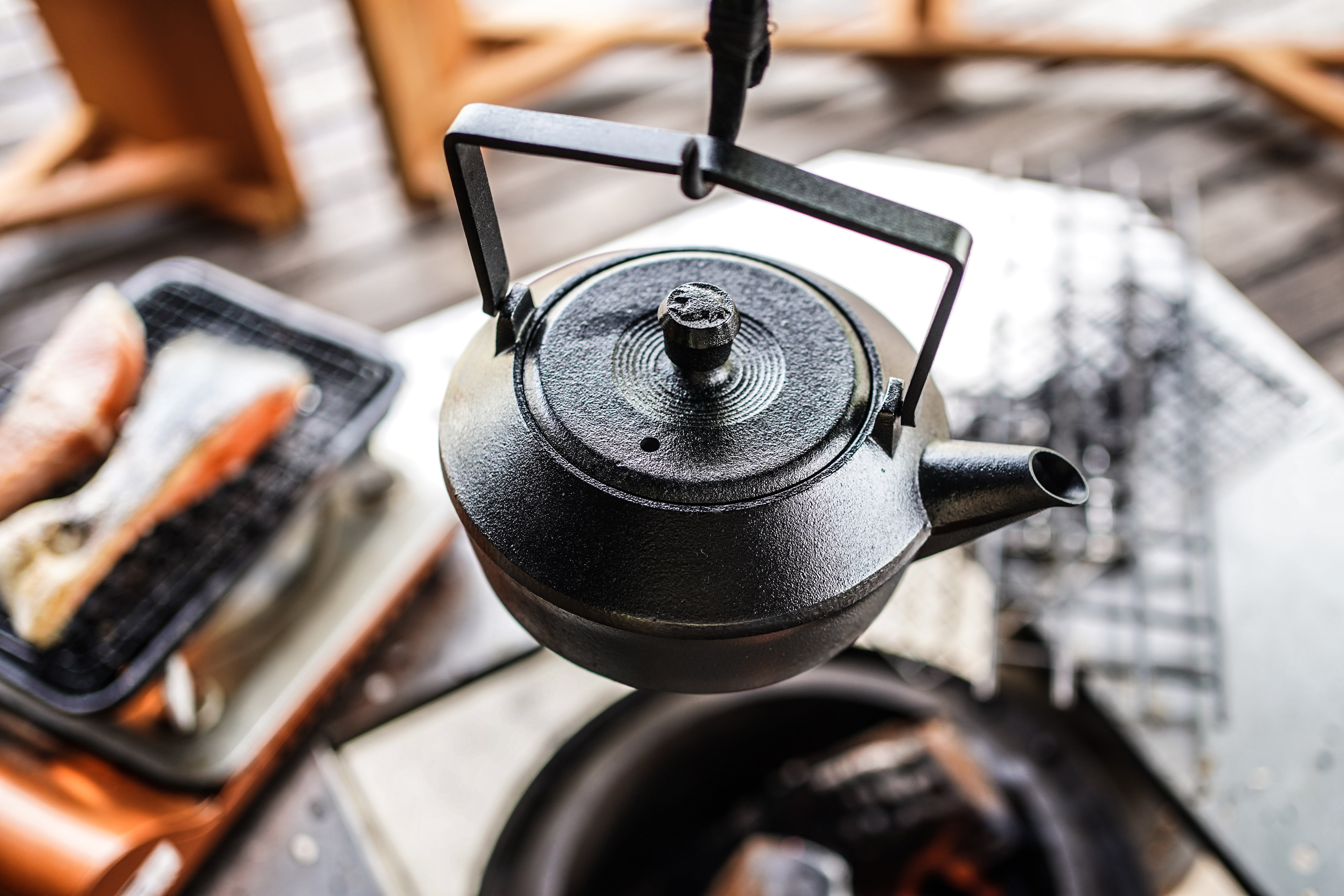 洗練された見た目もさることながら、機能面においても南部鉄瓶のメリットはたくさんあります。熱伝導率が良いため加熱から沸騰までが早く、保温性も優れていますのでキャンプシーンではお湯を沸かすだけでなく、熱燗やゆで卵などアイデア次第で様々な用途にお使いいただけます。