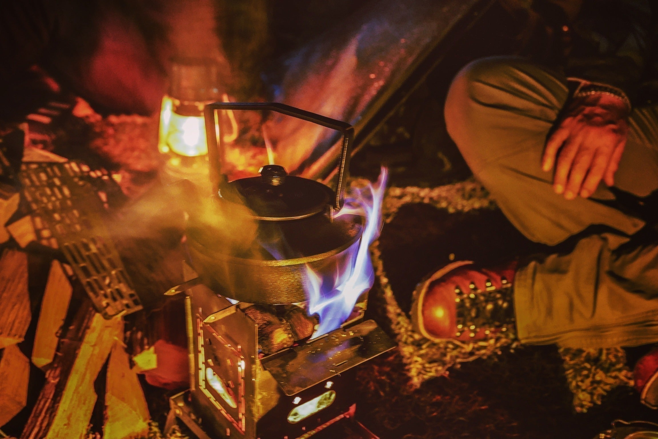 キャンプギアとして圧倒的な存在感。焚火に映える姿。焚火台や五徳に直置き、トライポッドで吊るしても良し。薪ストーブとの相性も抜群です。