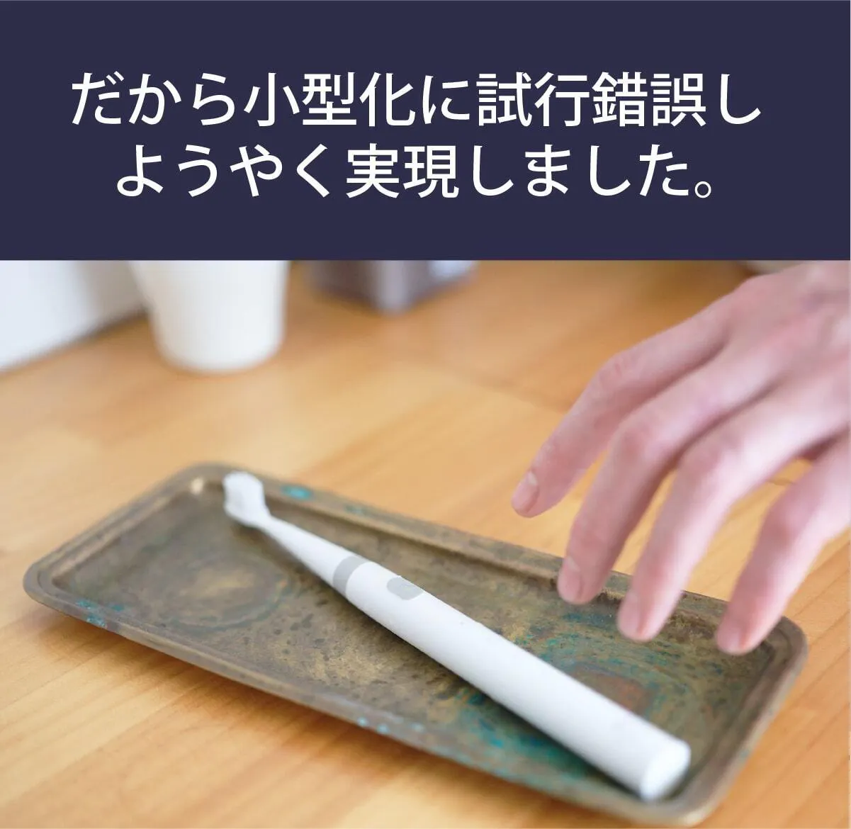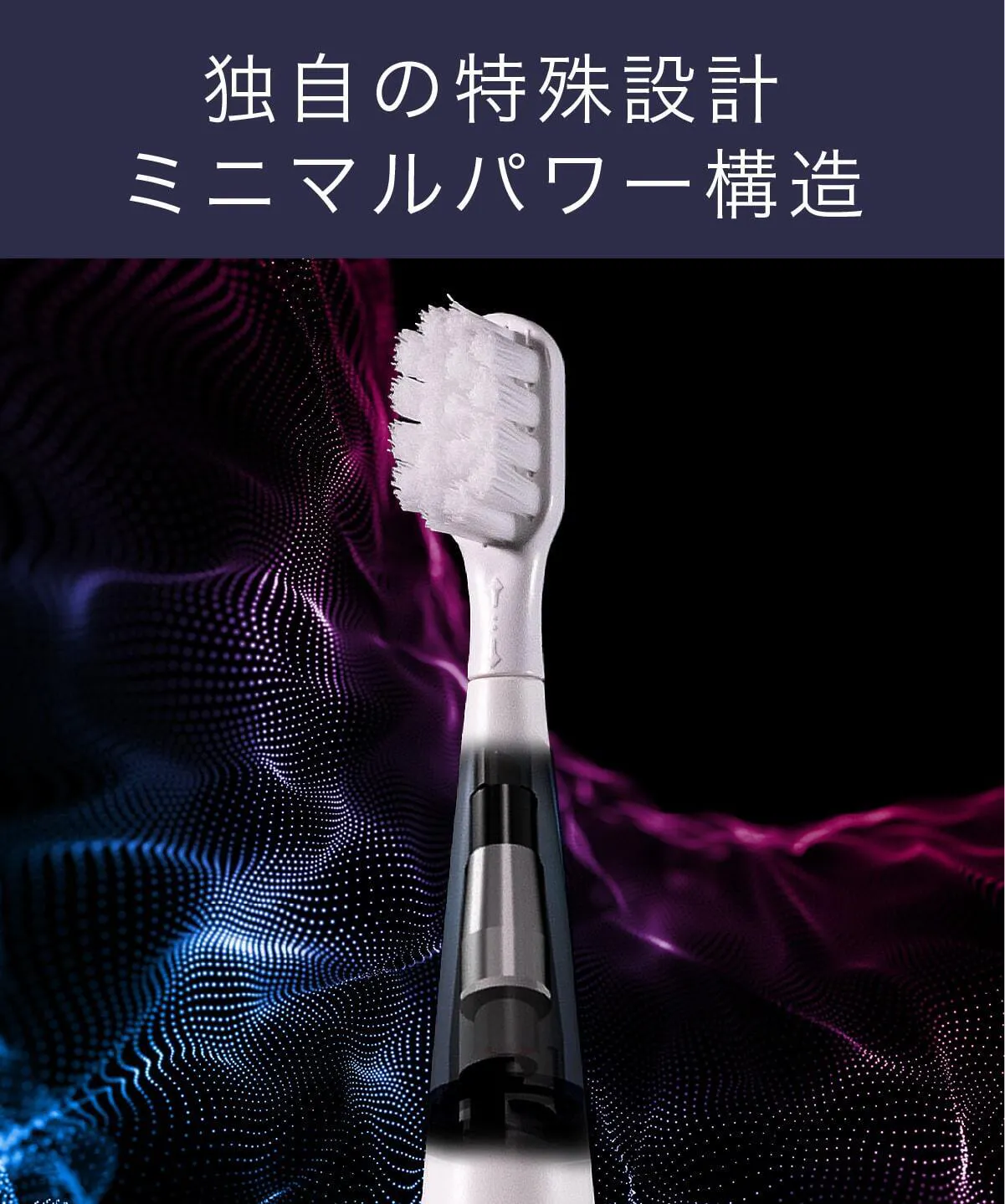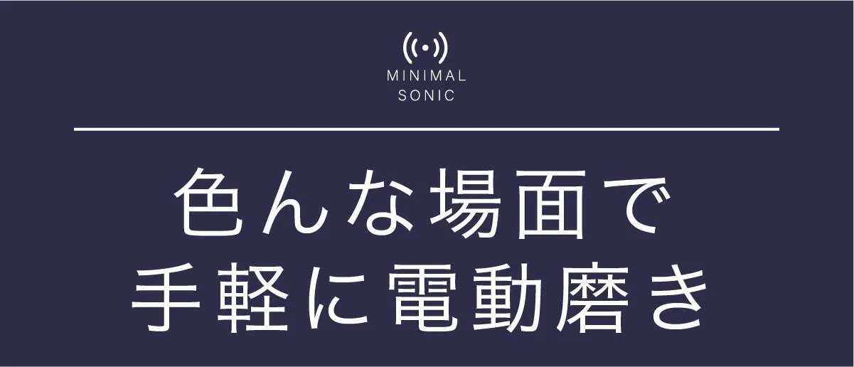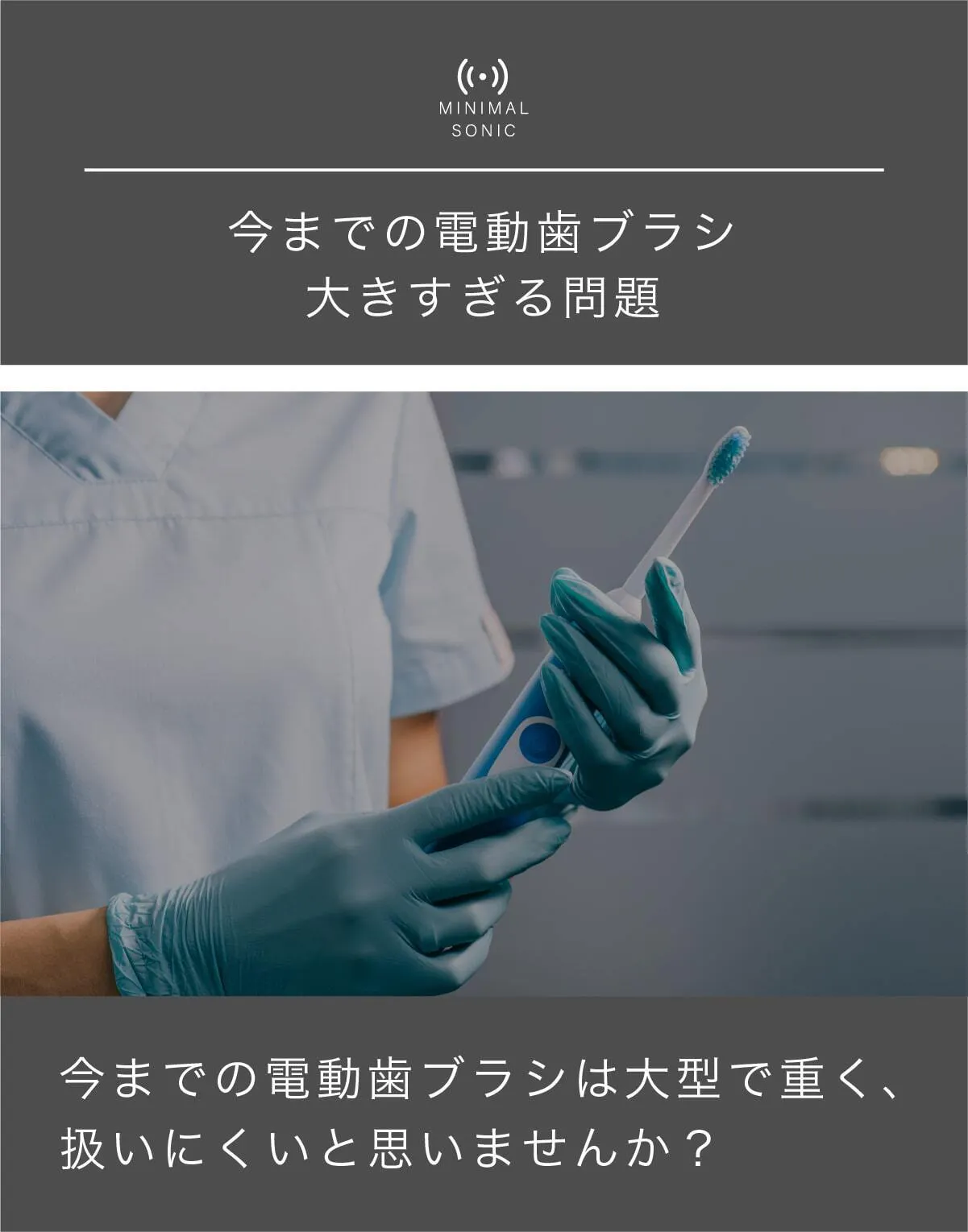 今までの電動歯ブラシを大きいと感じたことはありませんか?普通の歯ブラシから電動歯ブラシに変えた時にそれを大きく感じると思います。電動歯ブラシは構造上、大型化してしまうのですが、常識に囚われずまったく新しい電動歯ブラシを設計したのがこのミニマルソニックです。画期的な構造で小型でパワフル。未来の体験をはじめましょう。