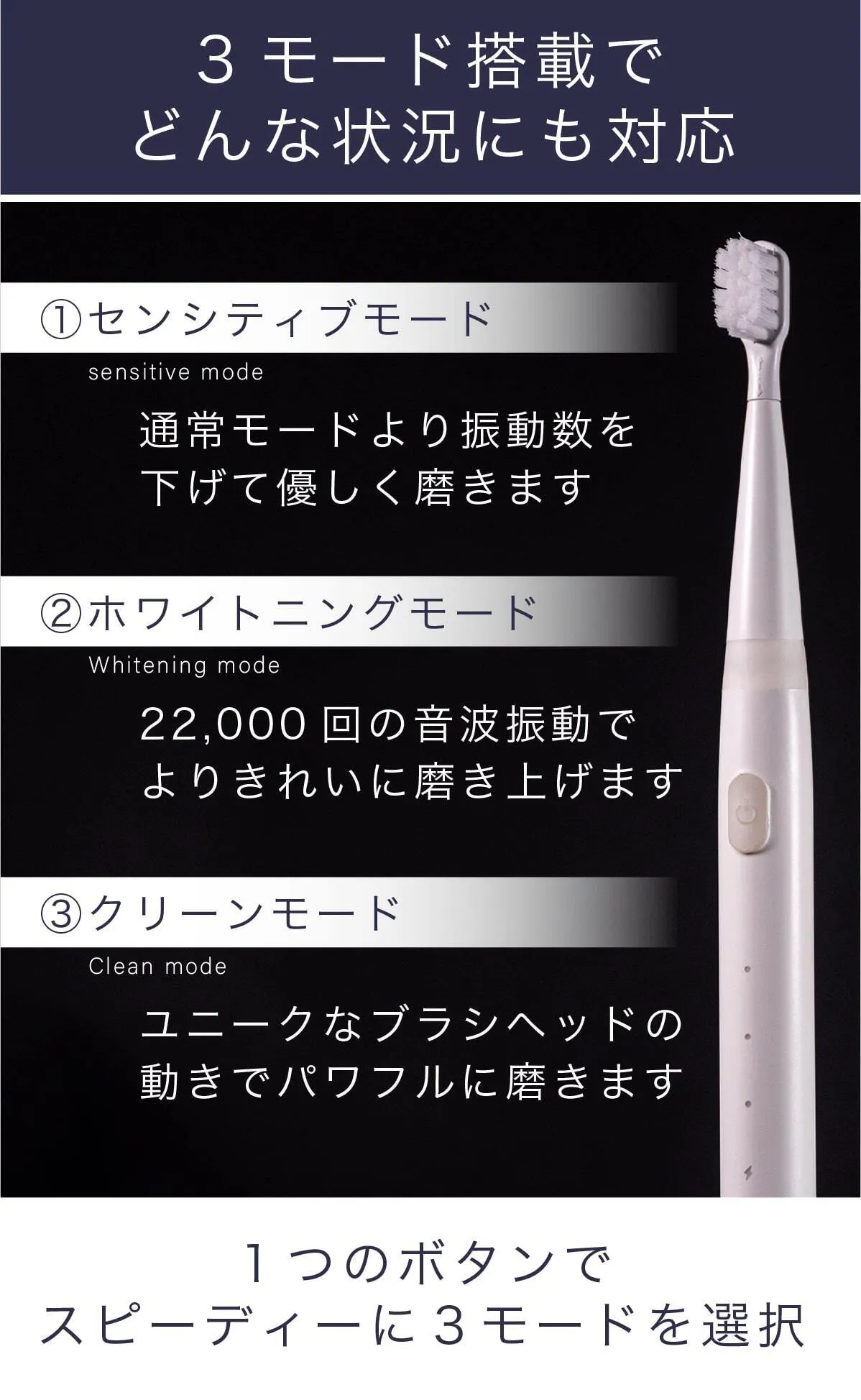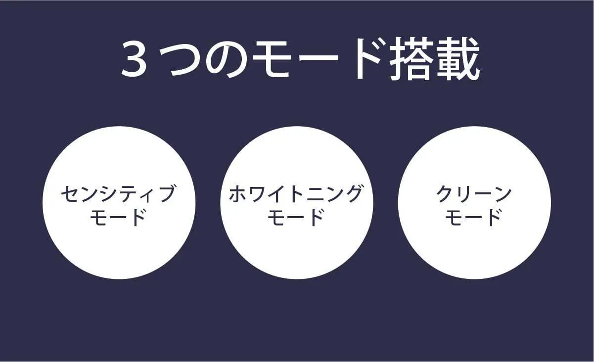 3つのモードを搭載し、あなたの歯磨きの状態によって最適な磨き方を選べます。電動歯ブラシに慣れない方には「センシティブモード」白い歯を目指す方には「ホワイトニングモード」汚れをかき落としたい方は「クリーンモード」でお口の中をきれいに。