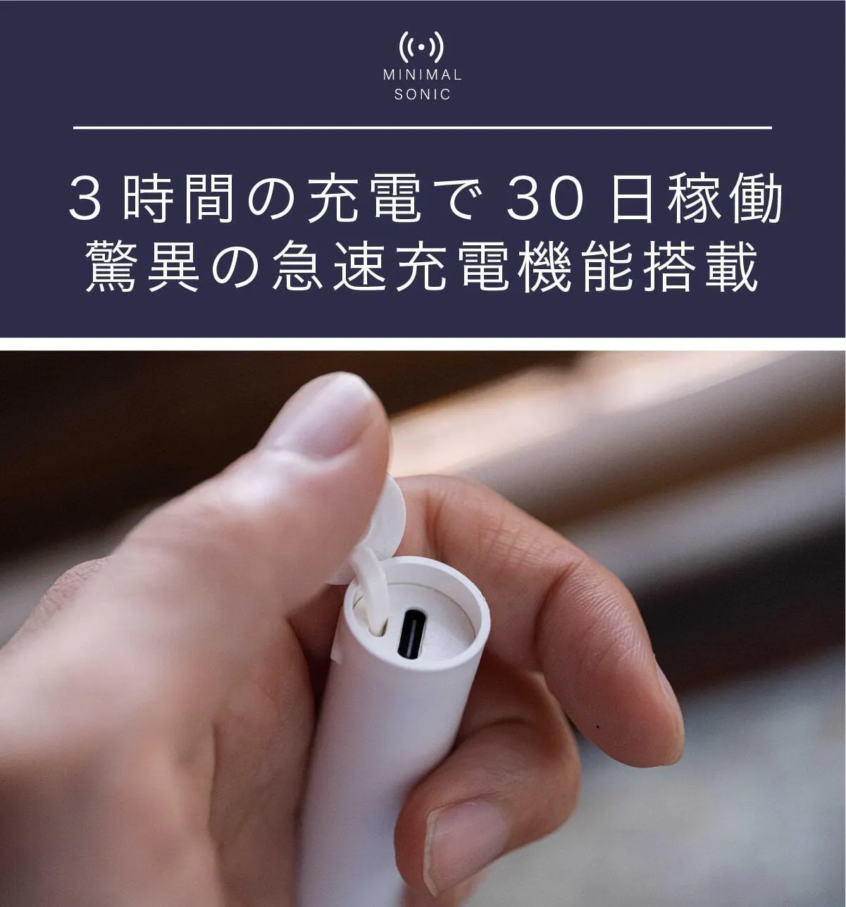 ミニマルソニックは長時間稼働を実現したタイプC急速充電を搭載。わずか3時間の充電だけで、なんと30日間も稼働します。
