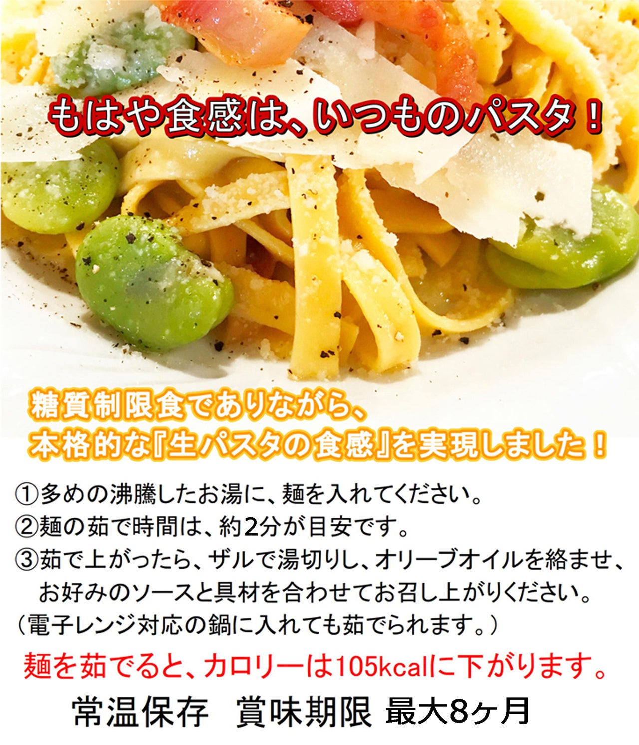 ②通常の小麦原料パスタなどと比べて、1食の炭水化物・カロリー摂取量が、約10分の1になる。