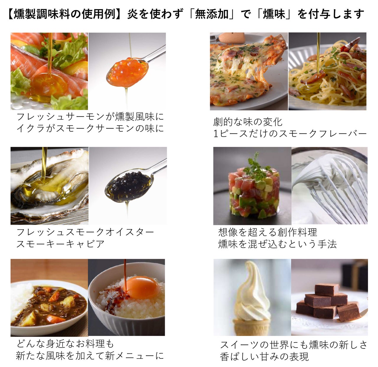 (例)サーモンや牡蠣にかけると、スモークサーモンパスタやスモークオイスターパスタに