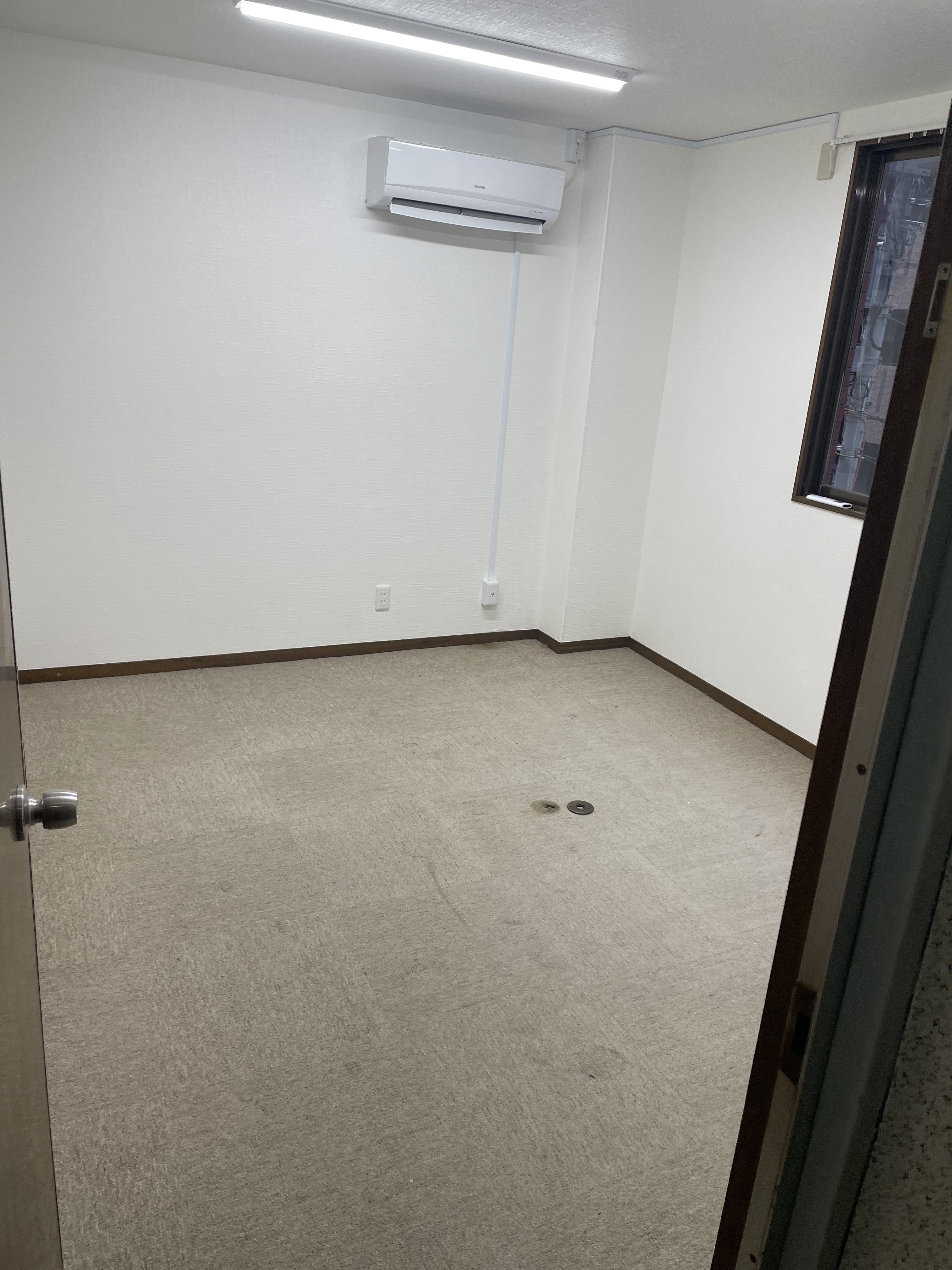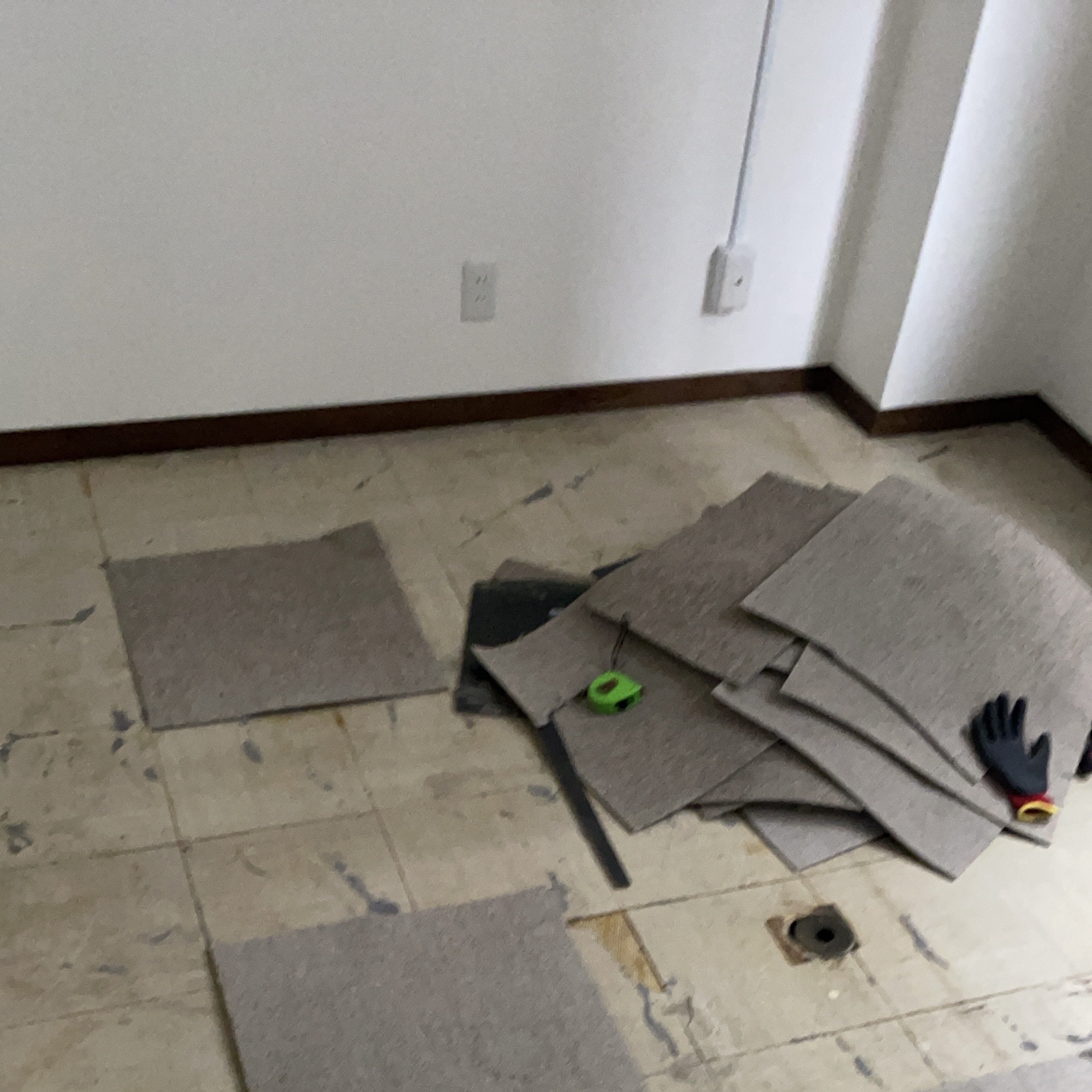 元のクッションフロアを剥がし、学校のような木目調のフロアタイルに交換している途中です。