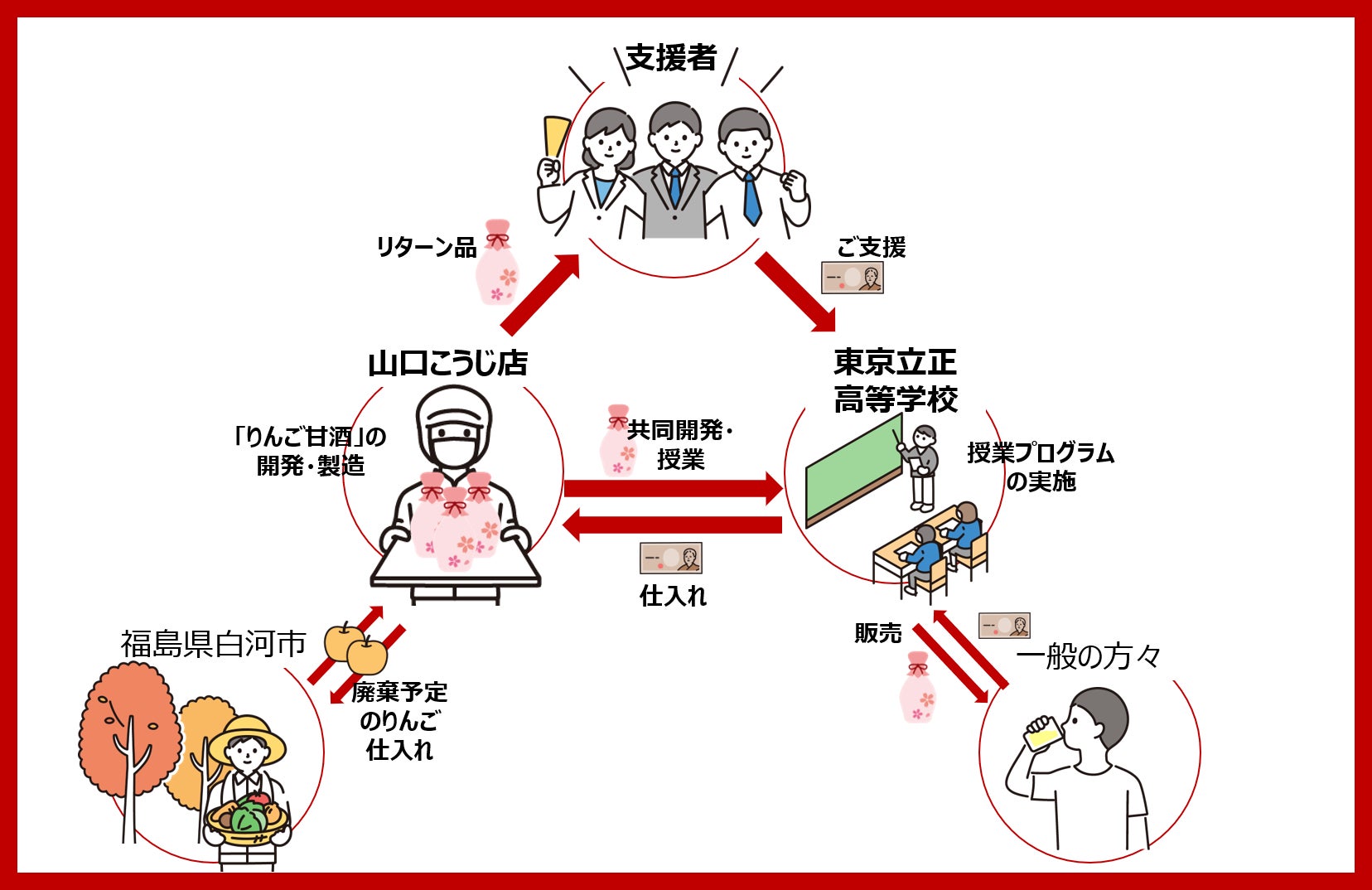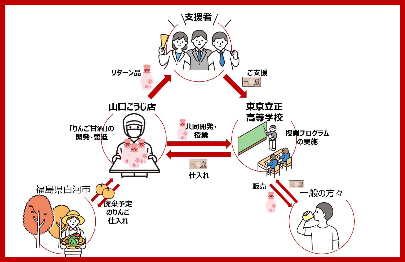 また、リターン品として山口こうじ店の「りんご甘酒」を仕入れることで、廃棄農作物の削減に取り組む同店への支援につながるサイクルを作りたいと考えています。