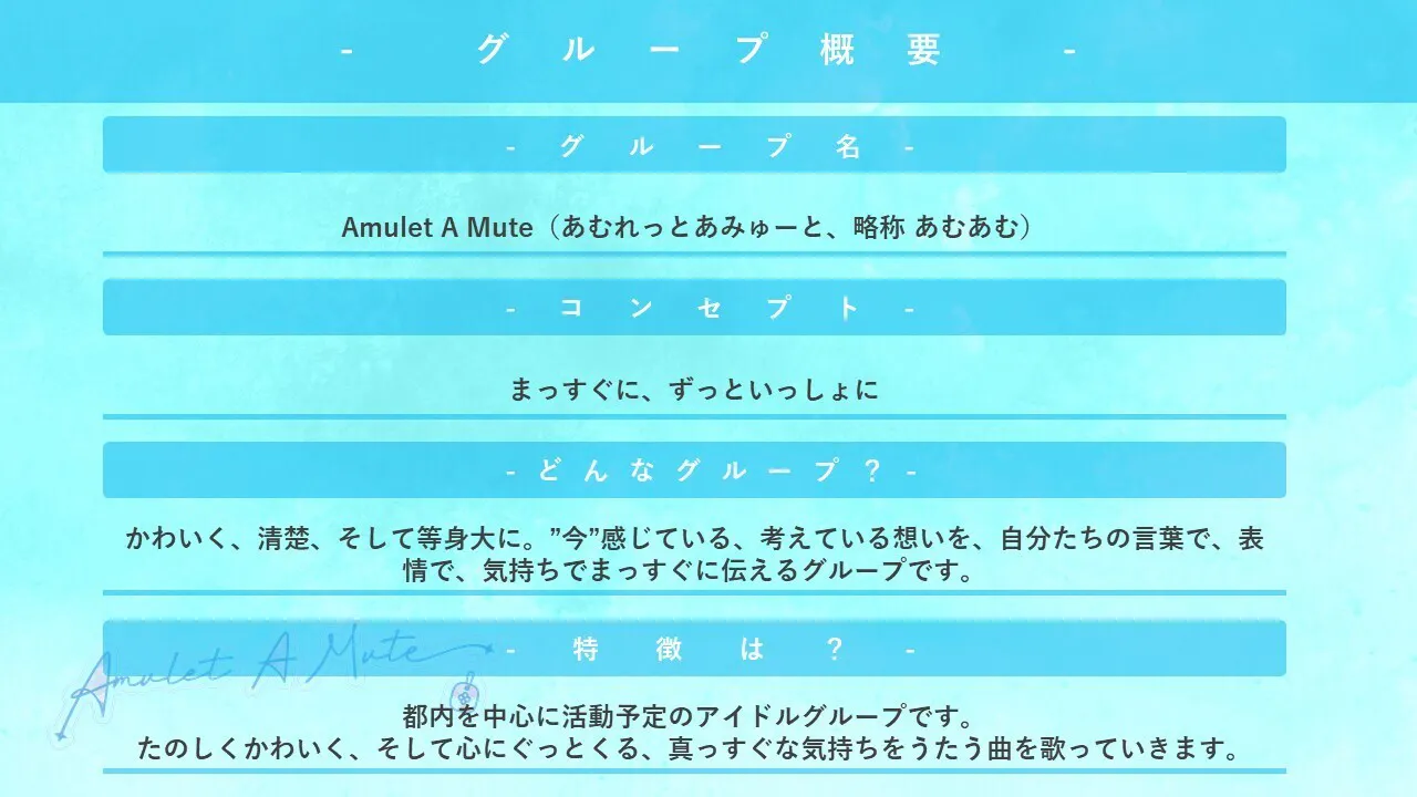 はじめまして、Amulet A Mute(あむれっとあみゅーと)と申します。都内を中心に活動予定の、2023年にデビューする5人組(予定)のアイドルグループです。