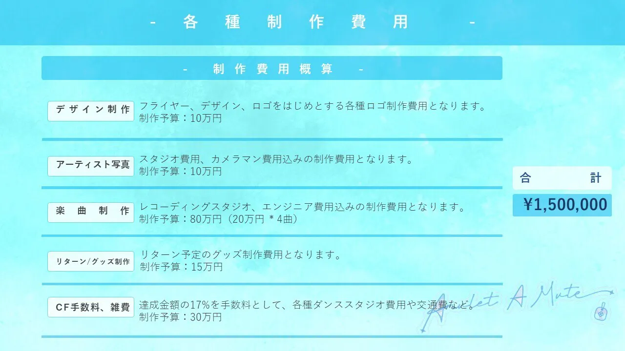 ご支援いただいた資金を元に、以下の制作を予定いたします。グループを形作る根幹部分にかかる費用として、¥1,500,000という目標を設定しております。