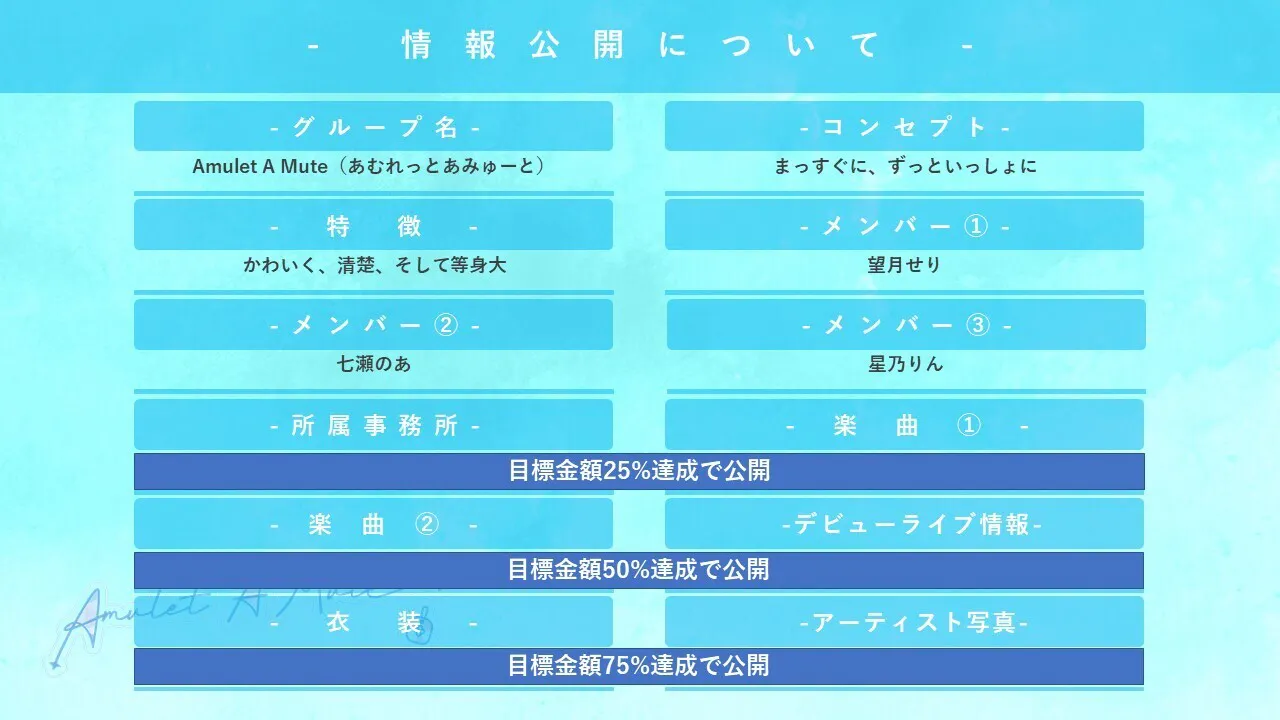 アイドルグループAmulet A Mute(あむれっとあみゅーと)のデビューを実現いたします。