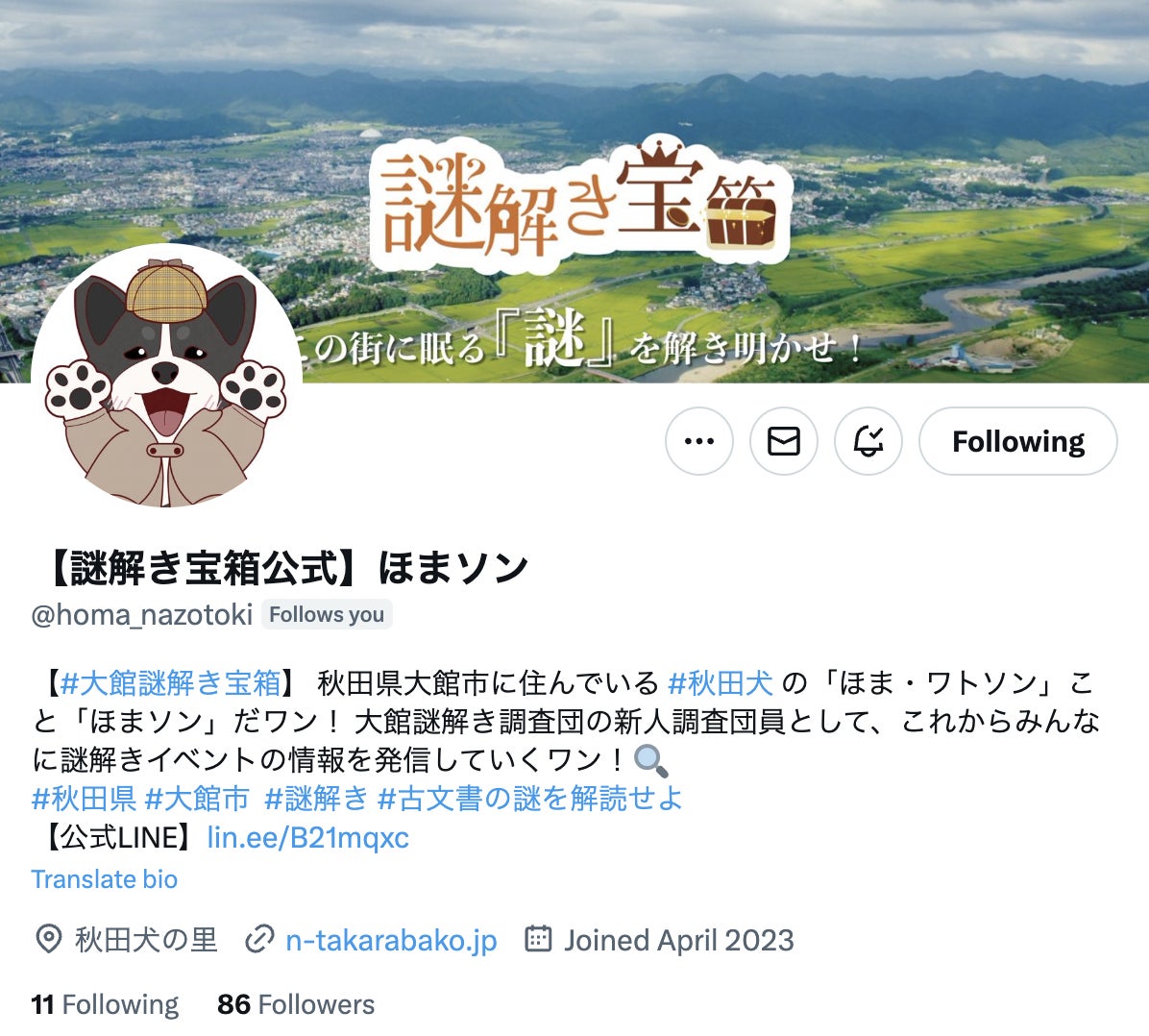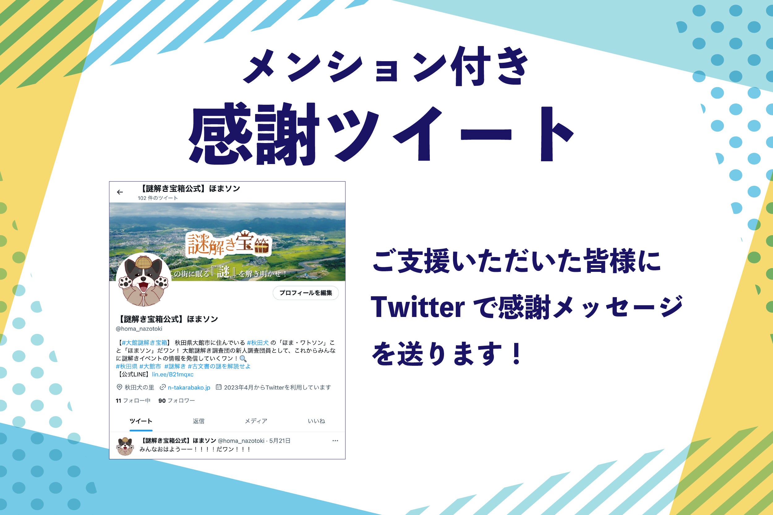 謎解き宝箱公式Twitterアカウントのほまソンが、メンション付き感謝ツイートをさせていただきます。 大館市には行くのは難しいけれど、ご一緒に大館市を盛り上げたい!応援したい!という方におすすめです。