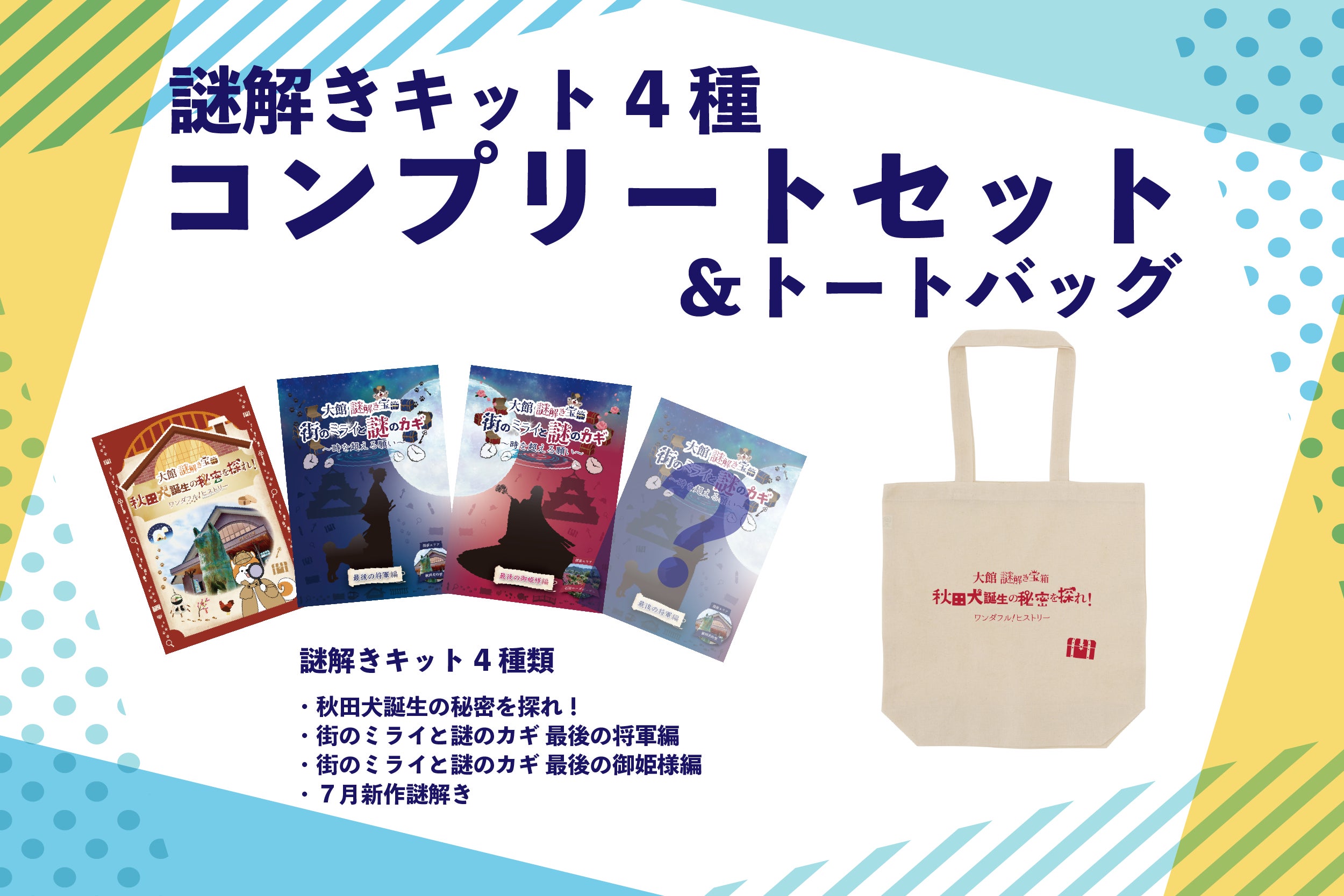 大館市を周遊しながら楽しめる新作謎解きキットを含め、現在販売中の謎解き宝箱全4種のコンプリートセットの引換券です。さらに、2月の謎解きイベントで大好評だったオリジナルトートバッグもお渡しします!大館市各地で、色々な謎解きを楽しみませんか?