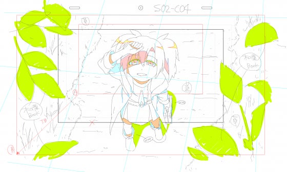 原画制作はまずレイアウトから始まります。今回のアイキャッチに使われているグラフィックがそうです。影などを考慮した複数の色のついた線画と、最終的に画面をどのように移動するかなどの簡単な指示が書かれています。そこから第一原画を制作します。