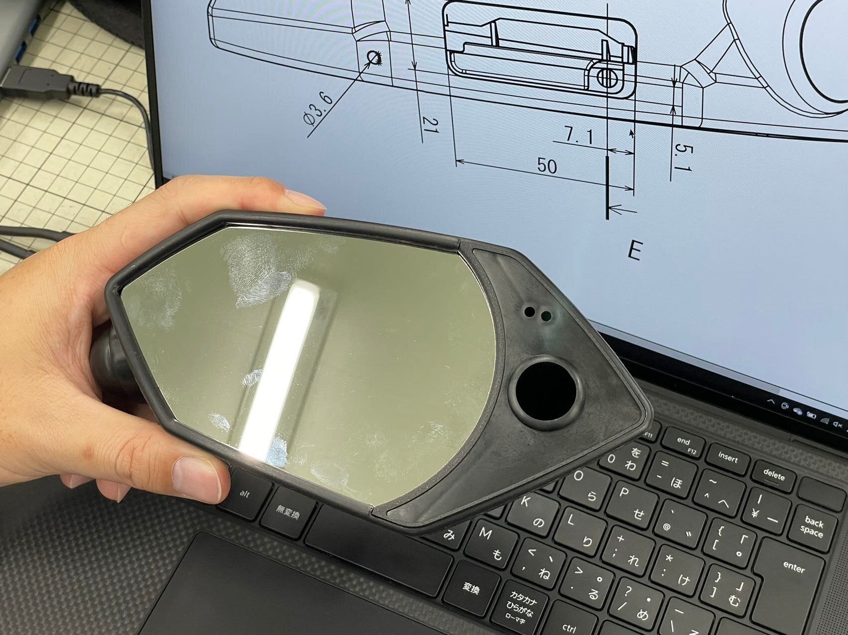 上記写真はドラレコユニットは入っていませんが、鏡面部と筐体の隙間のチェックを行っている状況です。皆様が見られている形になっていることが良くわかります。